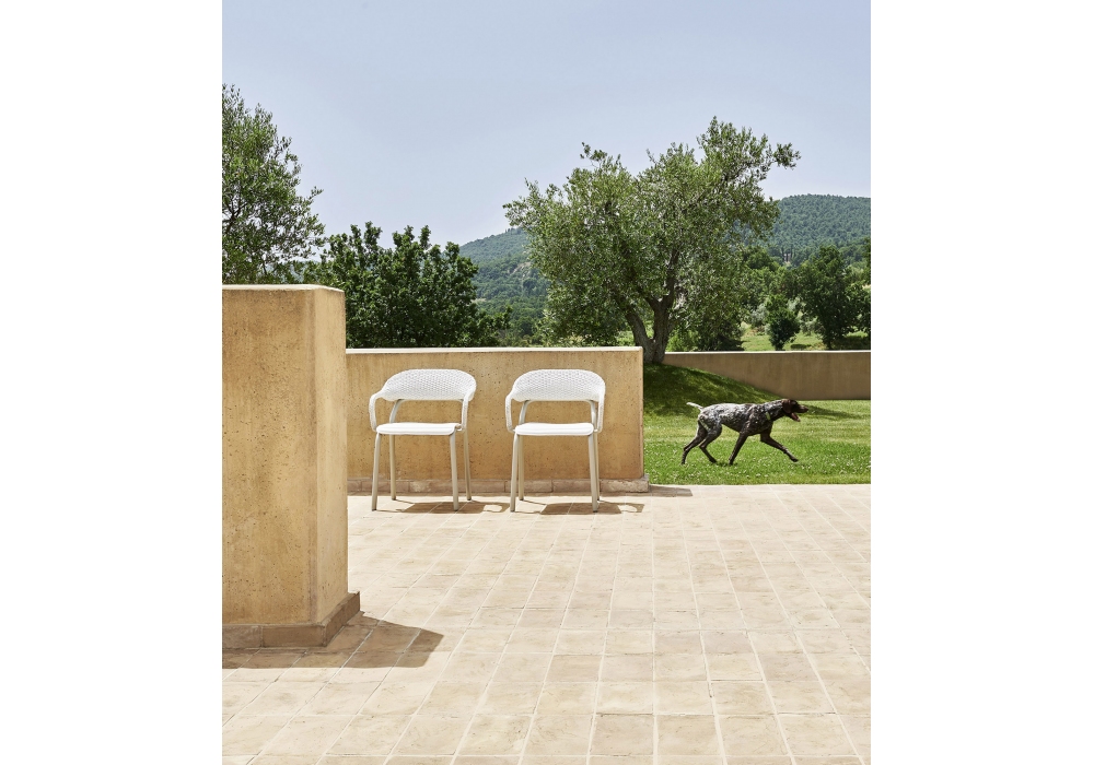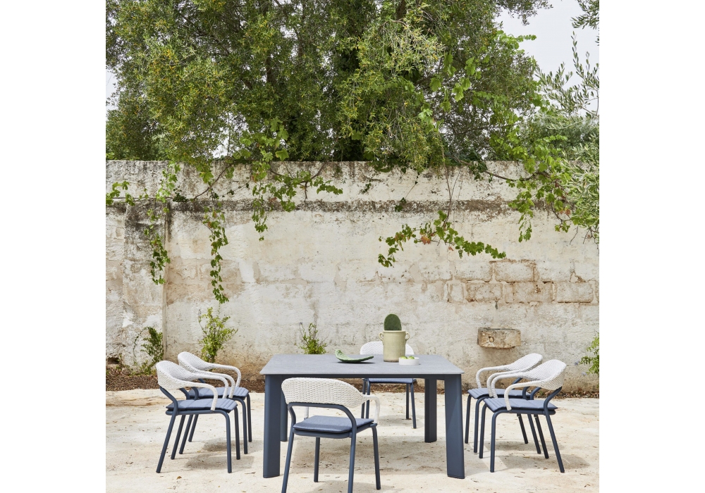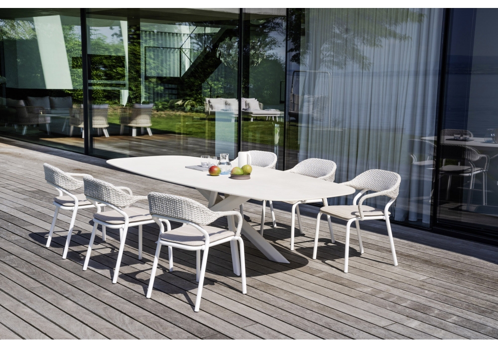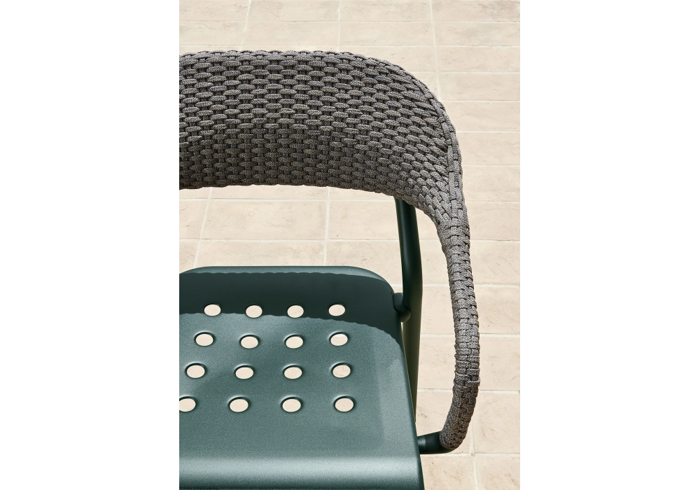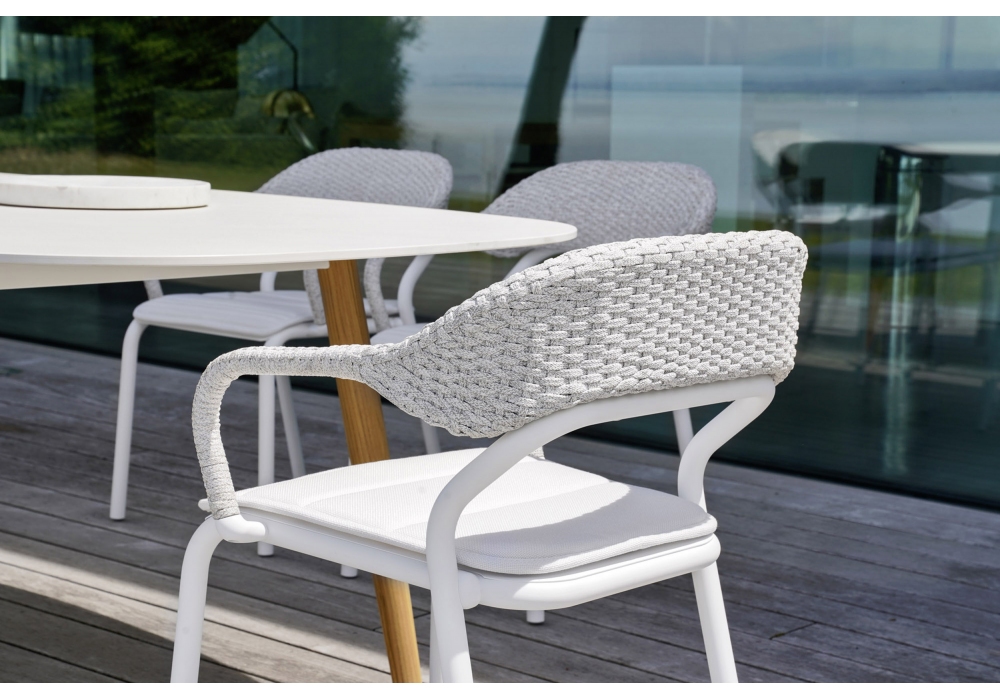 Noss firmata da Edoardo Gherardi per Varaschin è una poltroncina con struttura in tubo di alluminio e sedile in lamiera di alluminio spessore verniciati a polveri. Schienale intrecciato a mano con corda in fibra sintetica. Cuscino opzionale con imbottitura da esterno. Disponibile in differenti finiture.