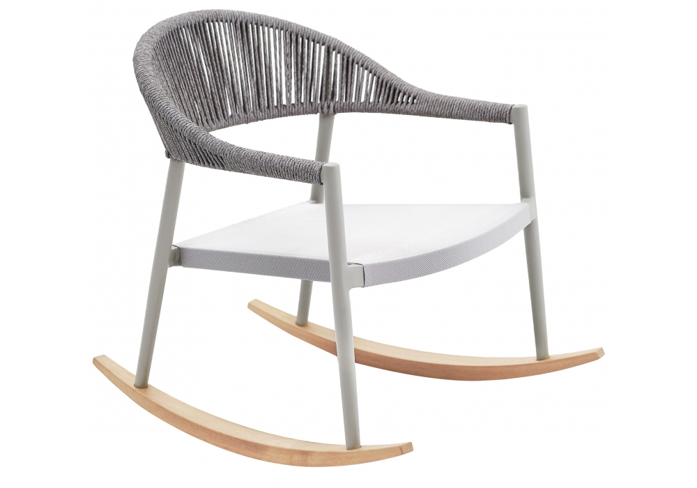 Clever firmata da R&D per Varaschin è una poltrona a dondolo con struttura in alluminio verniciato a polveri, seduta in tessuto tecnico, schienali intrecciati in cordino sintetico. Disponibile in differenti finiture. Slitte in legno massello di Iroko.