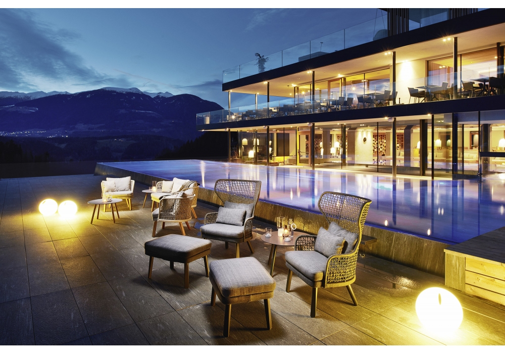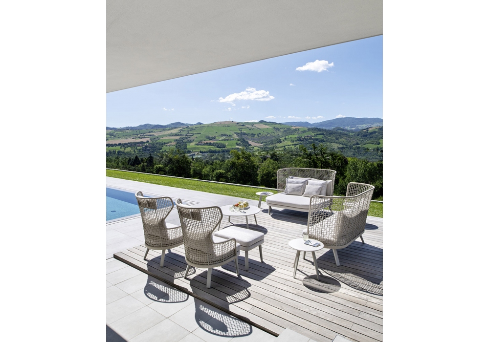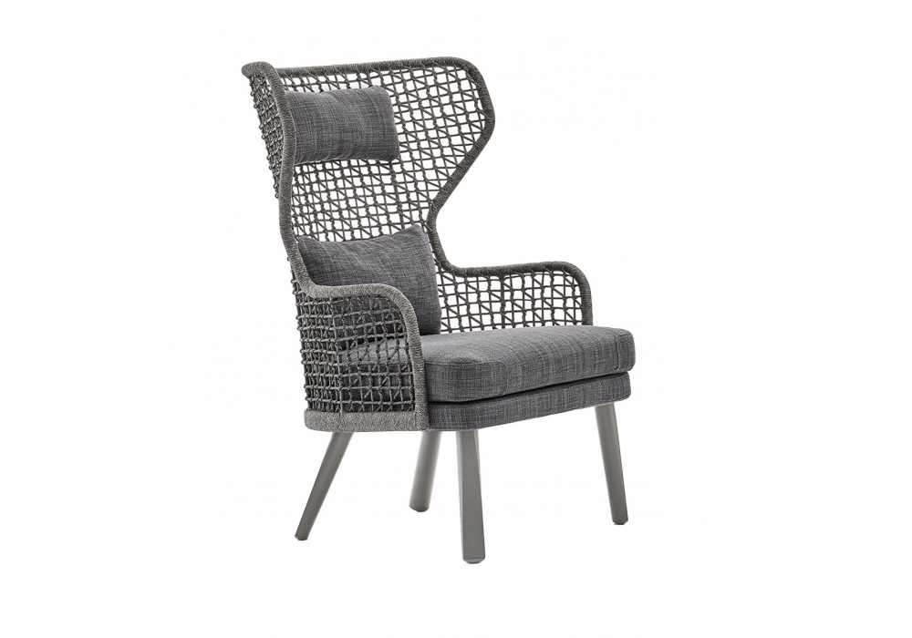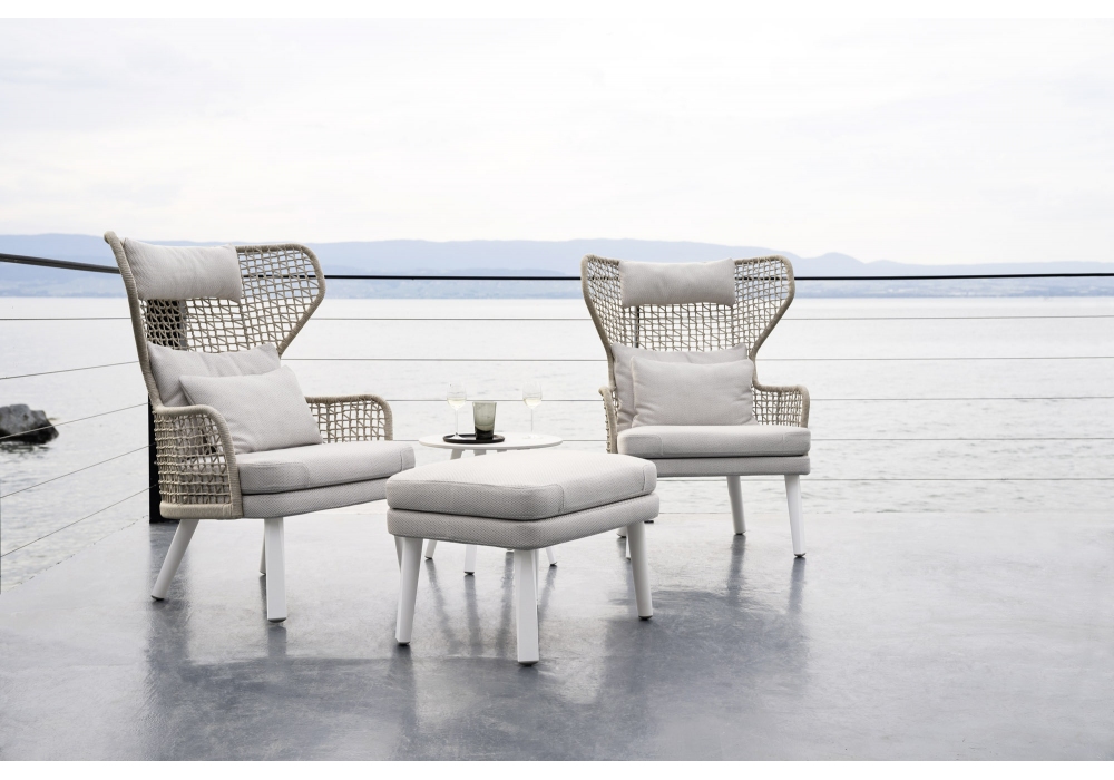 Emma firmata da Monica Armani per Varaschin è un bergere outdoor con gambe in alluminio o iroko massello. Seduta tappezzata in tessuto con struttura sedile di polipropilene. Schienali con telai di alluminio verniciati a polveri intrecciati o in multistrato di legno per esterni e rivestiti in tessuto. Disponibile in differenti finiture.