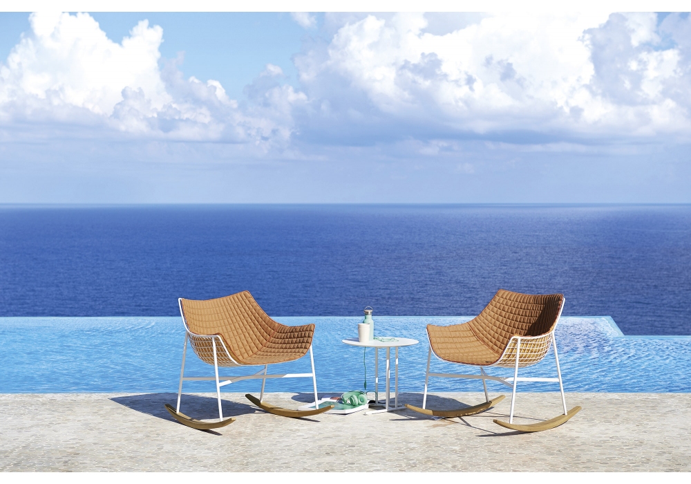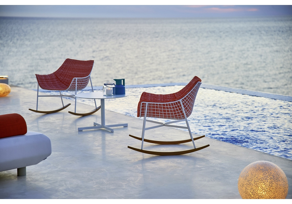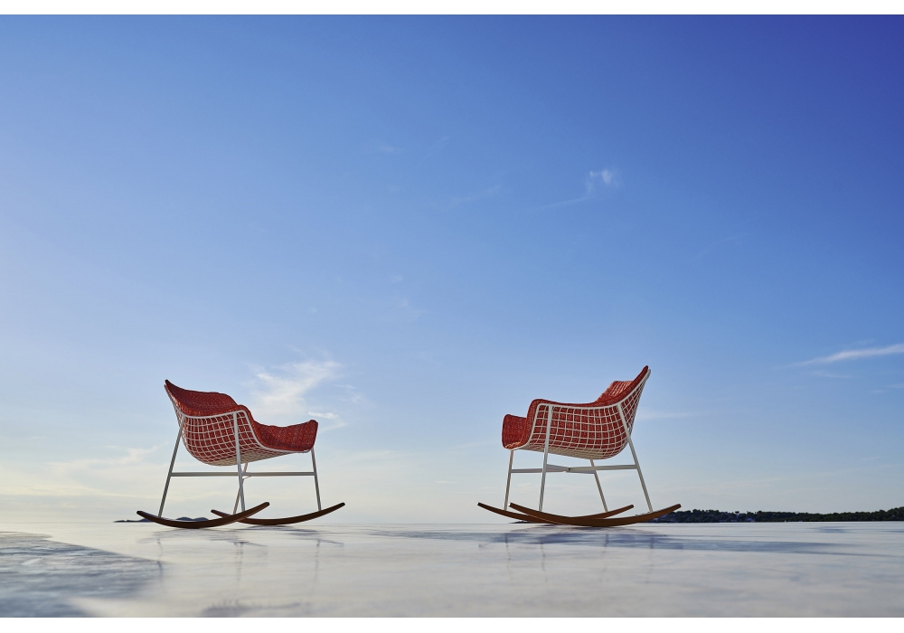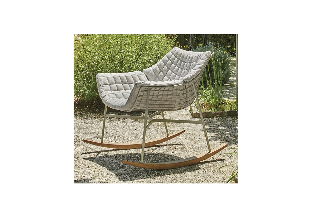 Summer Set firmata da Cristophe Pillet per Varaschin è una poltrona a dondolo con struttura in acciaio verniciato a polveri. Disponibile in differenti finiture. Slitte in legno massello di Iroko.