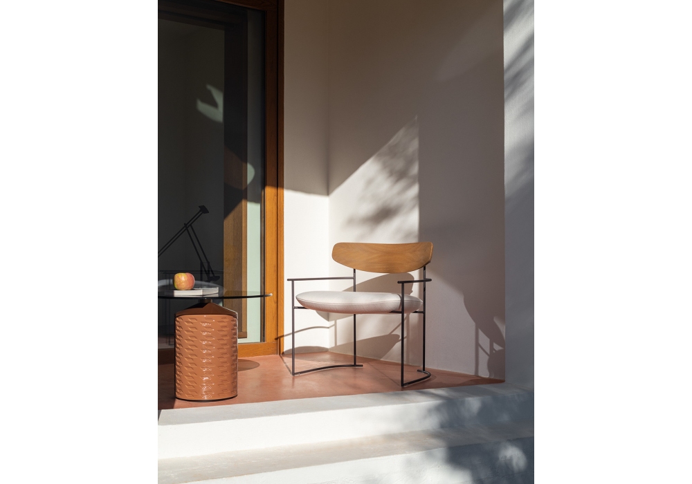 Keel Outdoor firmata da M + V per Potocco è una poltrona da esterno con struttura in tondino di metallo e schienale in massello di Iroko. La seduta è imbottita e rivestita iun differenti finiture di tessuto outdoor.