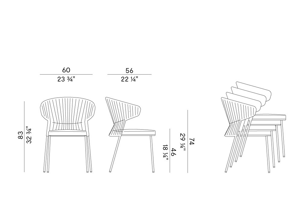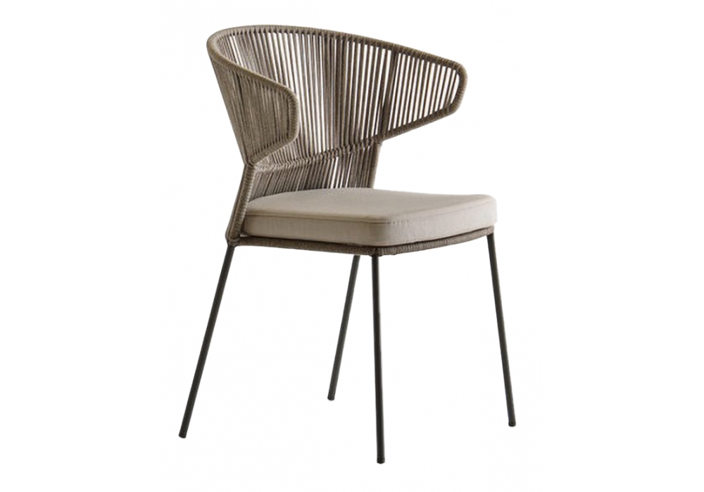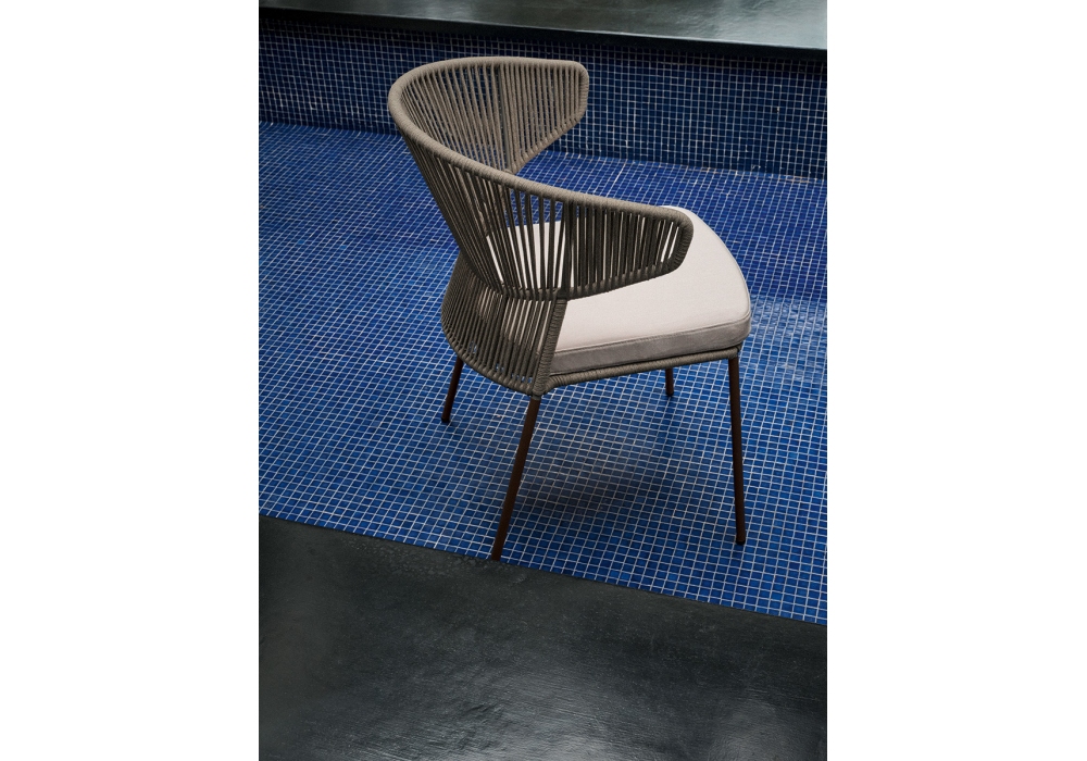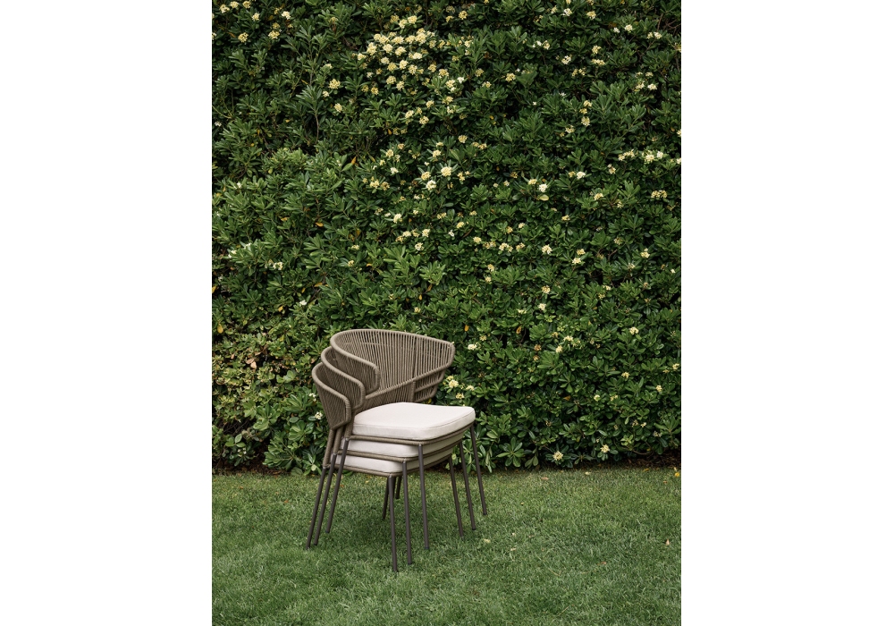 Ola firmata da Radice Orlandini per Potocco è una poltroncina dining da esterno con schienale in tondino di metallo verniciato a polvere per esterno intrecciato a mano in fettuccia “Fly”. Il cuscino di seduta è imbottito in poliuretano espanso ignifugo e ovatta poliestere; il sottofodera in tessuto è impermeabile con cuciture sigillate; fodera finale in tessuti outdoor.