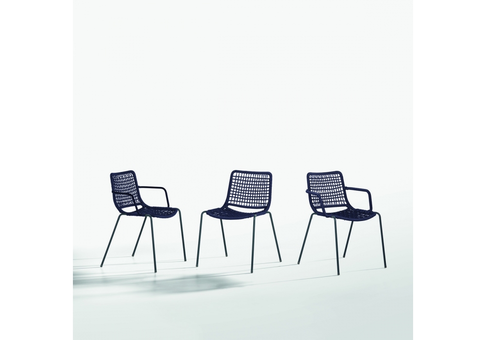Egao firmata da Toan Nguyen per Potocco è una poltroncina da esterno con gambe in tubo Inox verniciato e intrecci in cordino sintetico moka o in corda. Disponibile nella versione con braccioli in metallo in tinta alla struttura o in cordino intrecciato.
