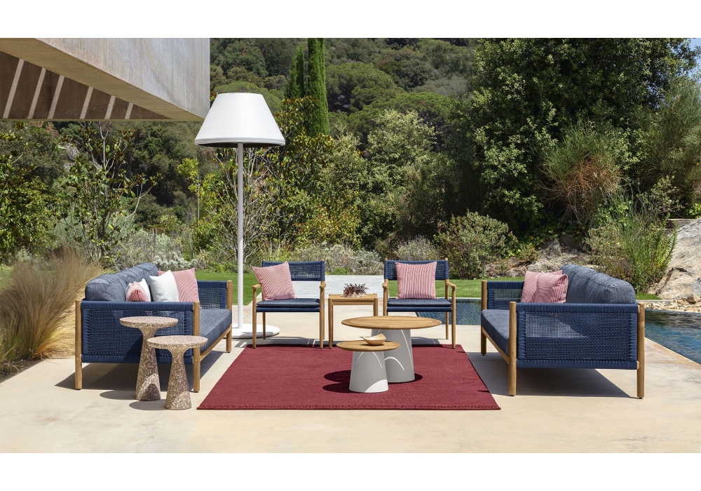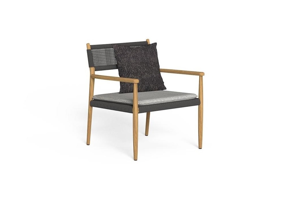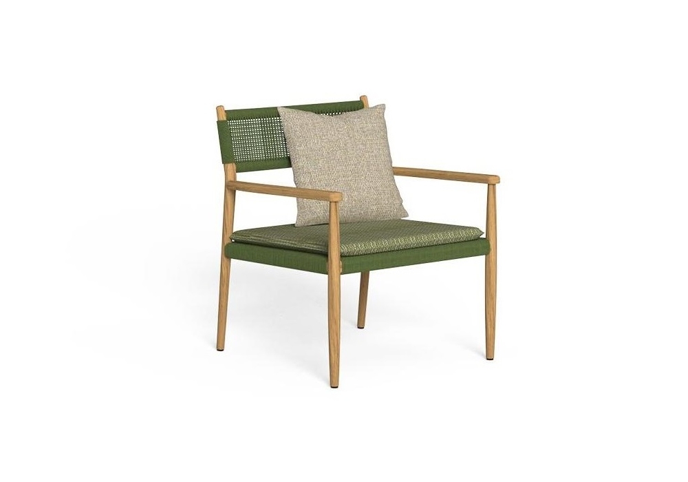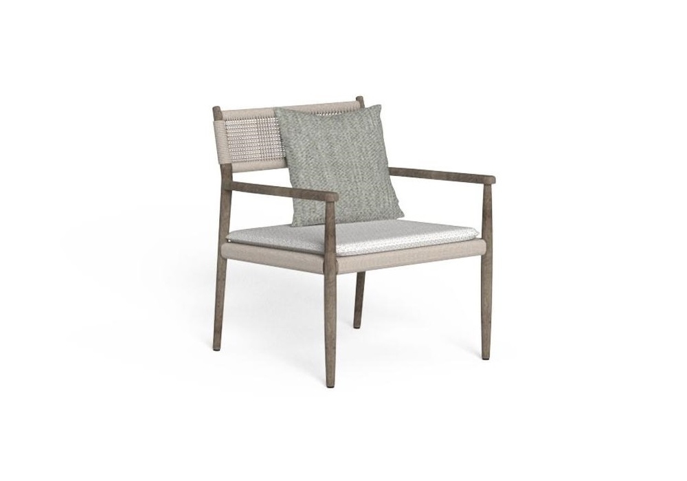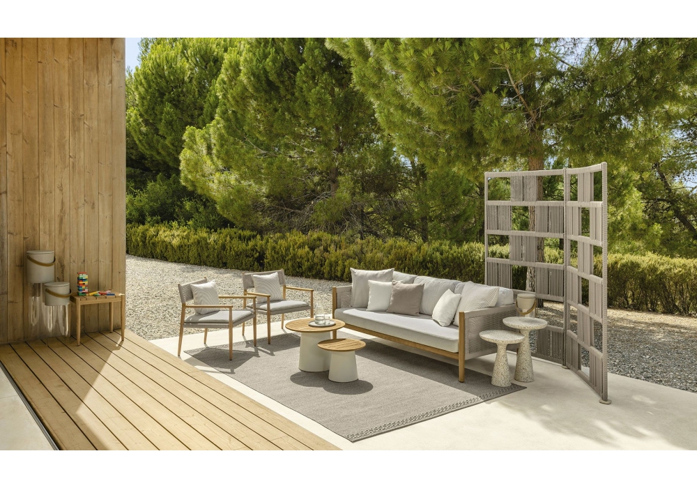 Dolcevita firmata da Talenti è una poltrona lounge con struttura in legno, schienale in corde sintetiche imbottite, seduta e cuscino rivestiti in tessuto. Disponibile in diverse finiture.