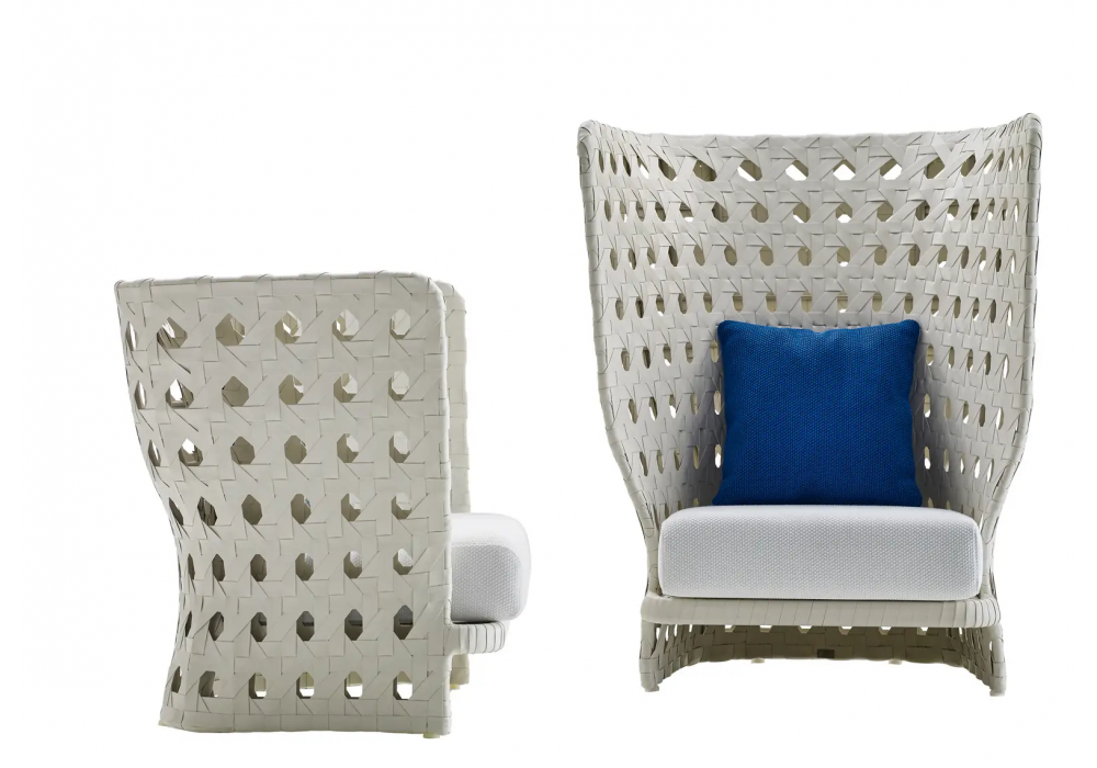 Canasta firmata da Patricia Urquiola per B&B Italia Outdoor è una poltrona con schienale basso con struttura in alluminio verniciato bianco ed intreccio in fibra di polietilene bianco. Rivestimento seduta in differenti tessuti.