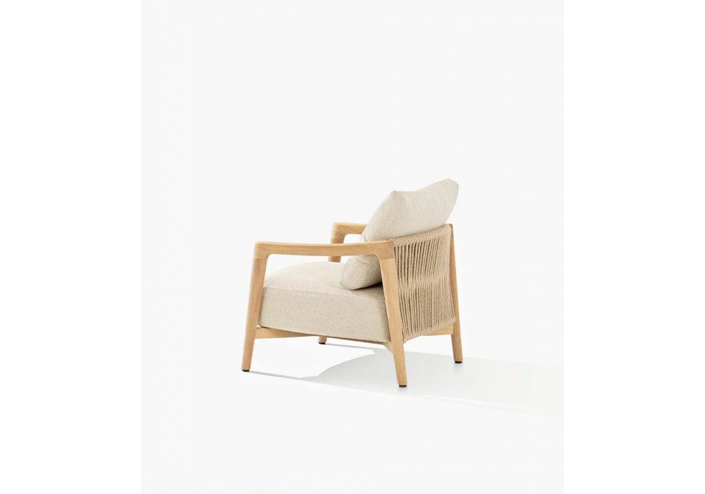 Ponte firmata da Emmanuel Gallina per Poliform è una poltrona con struttura in massello di teak e schienale in tubolare di acciaio inox verniciato, rivestito in corda nei toni mattone e testa di moro o in corda ritorta naturale. Cuscini di seduta e schienale in poliestere riciclato PET con inserto in poliuretano, rivestimento sfoderabile in tessuto. Disponibile cuscino opzionale.