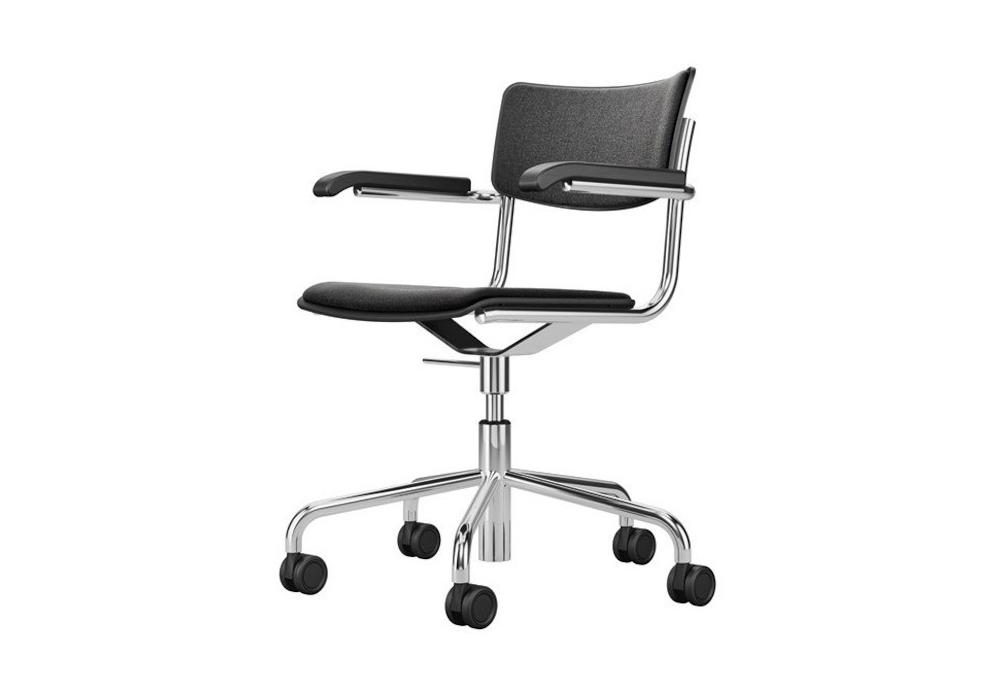 S 43 PVFDR firmata da Mart Stam per Thonet è una poltrona girevole con braccioli, con telaio in tubolare d'acciaio cromato o nero. Seduta e schienale in compensato di faggio sagomato, imbottiti con rivestimento in tessuto, pelle o cuoio. Altezza regolabile.