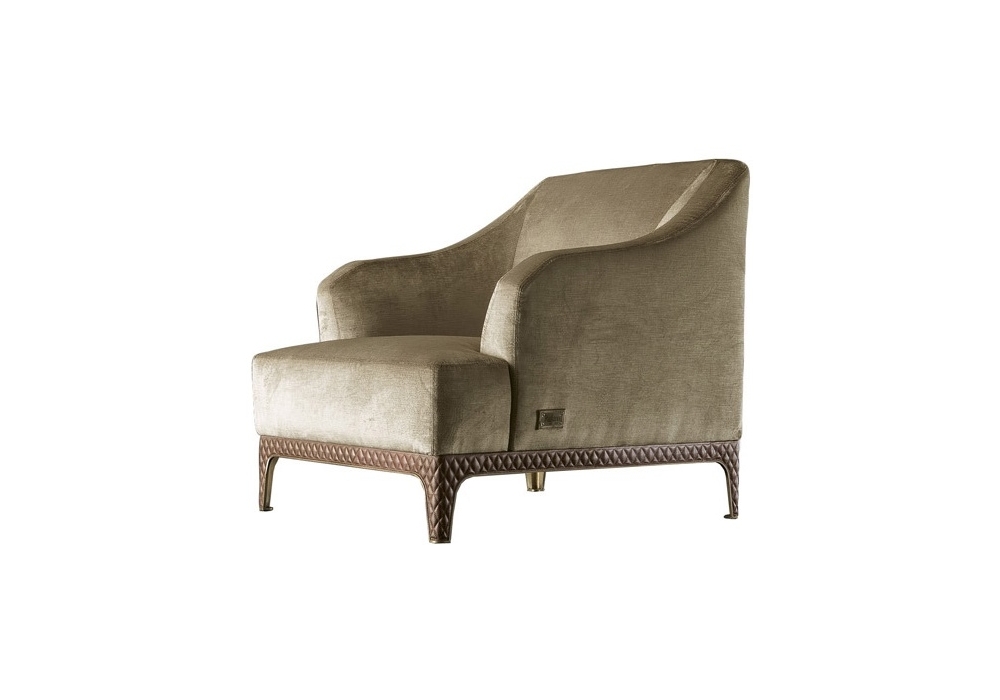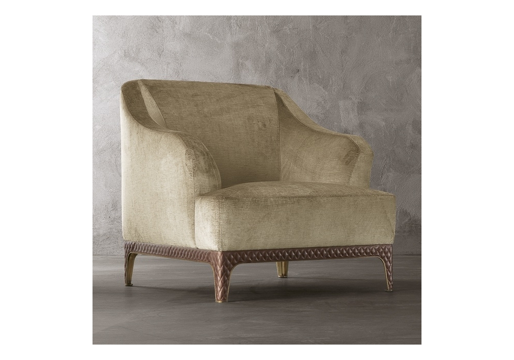 Oscar firmata da Rugiano è una poltrona disponibile con rivestimento in tessuto o pelle. Dettagli in acciaio o bronzo. Lavorazione matelassè o liscia della base.