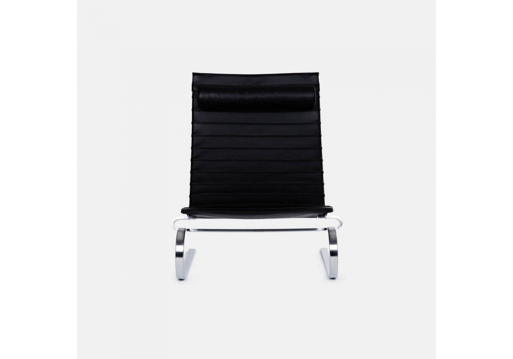 PK20 firmata da Poul Kjærholm per Fritz Hansen è una poltrona con poggiatesta realizzata interamente in pelle. Base in acciaio cromato opaco.