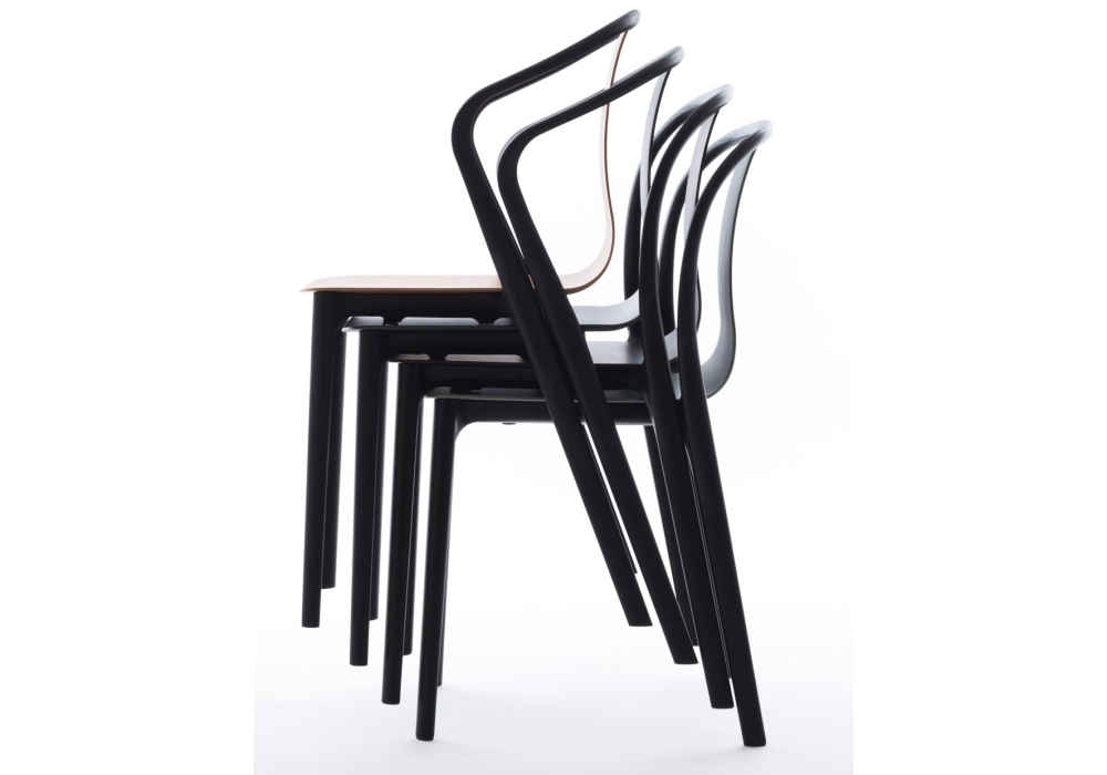 Belleville Armchair Wood firmata Ronan & Erwan Bouroullec per Vitra è una poltrona impilabile con scocca in legno multistrato curvato e finitura protettiva laccata naturale. Basamento e telaio in poliammide stampato a iniezione. Si chiama Belville, come il vivace quartiere parigino animato da bistrò e caffè dove si trova proprio lo studio dei designer, la nuova collezione progettata per Vitra.