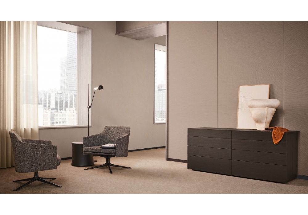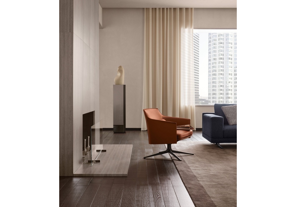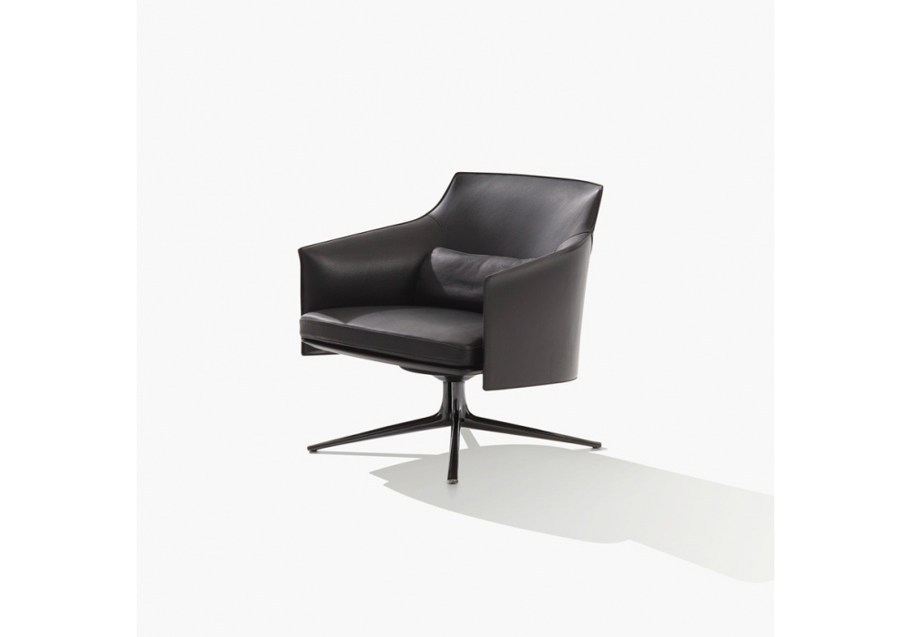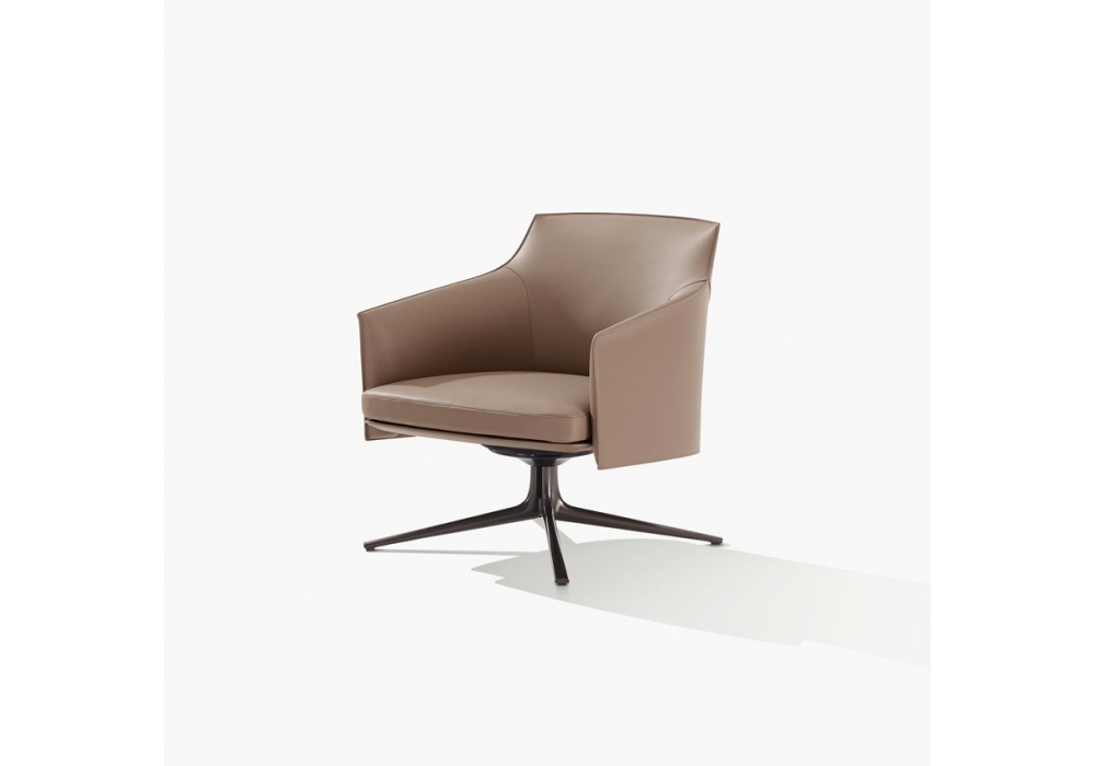 Stanford firmata da Jean-Marie Massaud per Poliform è una poltrona con base girevole con ritorno, struttura in poliuretano compatto e cuscino seduta in poliuretano flessibile a quote differenziate. Rivestimento in tessuto, pelle o in cuoio con abbinamento esterno in pelle.