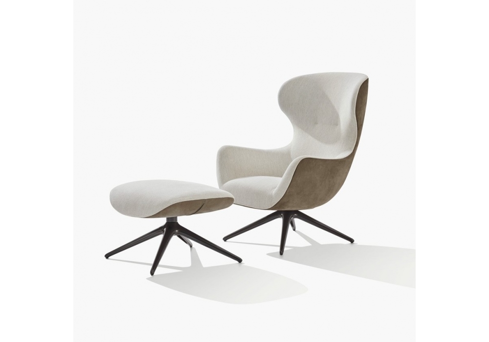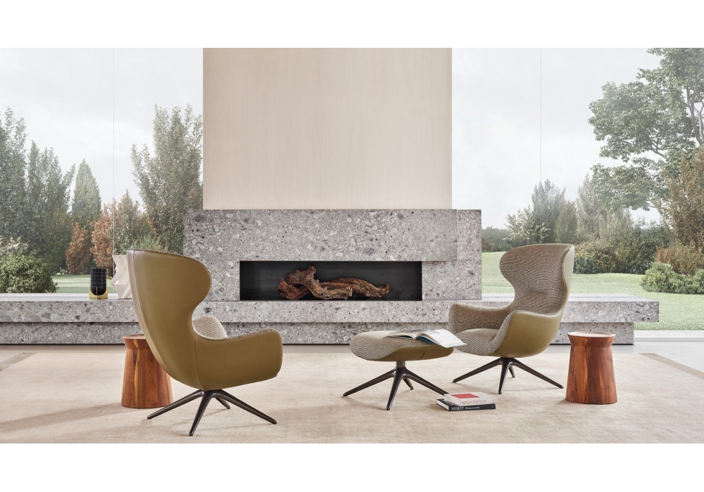 Mad Joker firmata da Marcel Wanders per Poliform è una poltrona girevole con base in metallo verniciato, rivestimento in tessuto o in pelle.