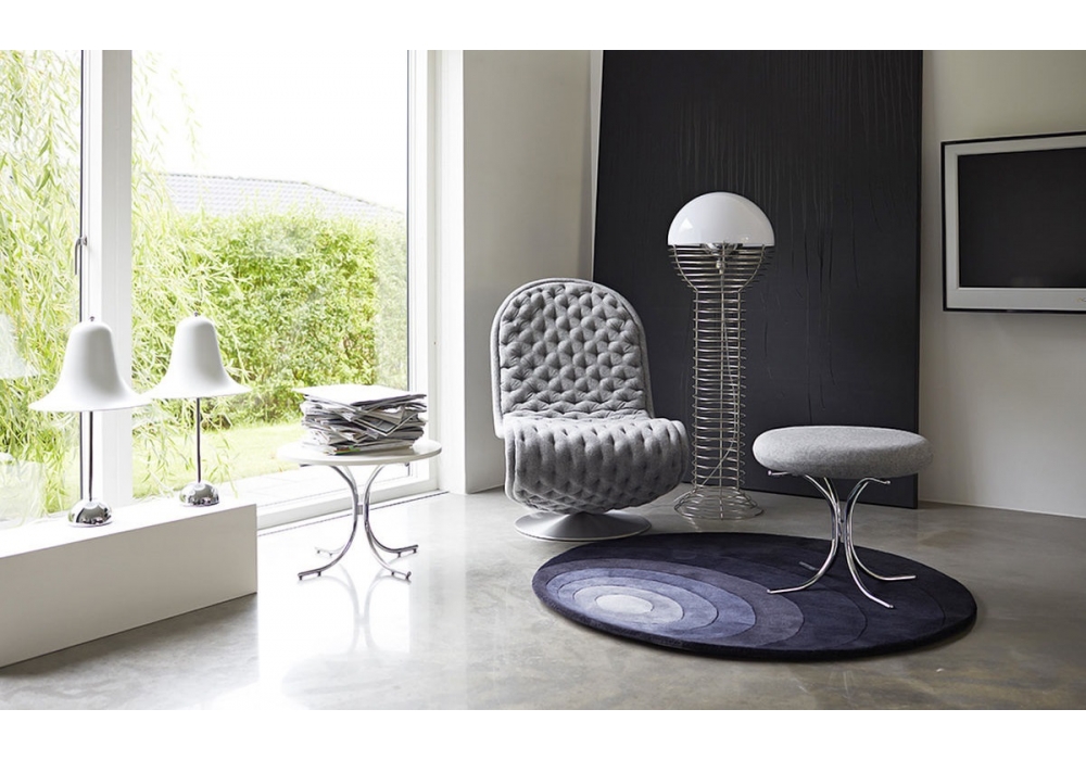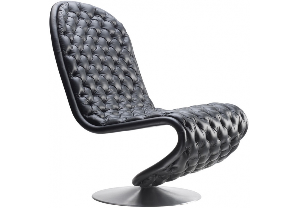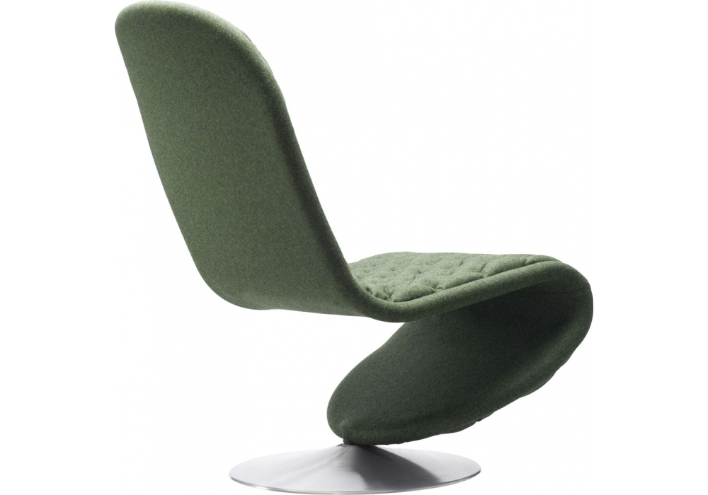 System 1-2-3 Lounge Deluxe firmata da Verner Panton per Verpan è una poltrona a forma di S con base rotonda in alluminio spazzolato e rivestimento disponibile in vari tessuti e pelli.