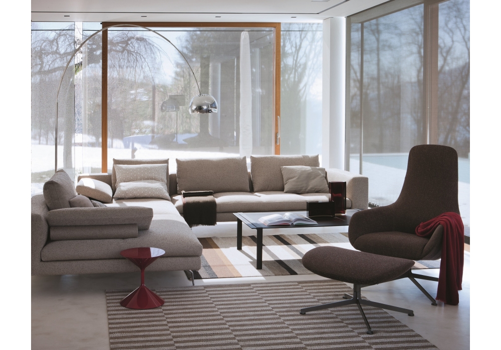 896 Kent firmata da Ludovica&Roberto Palomba per Zanotta è una poltrona girevole con base in acciaio verniciato. Imbottitura in poliuretano schiumato autoestinguente a quote differenziate/fibra poliestere termolegata. Rivestimento sfilabile in stoffa o in pelle. Disponibile con o senza pouf.