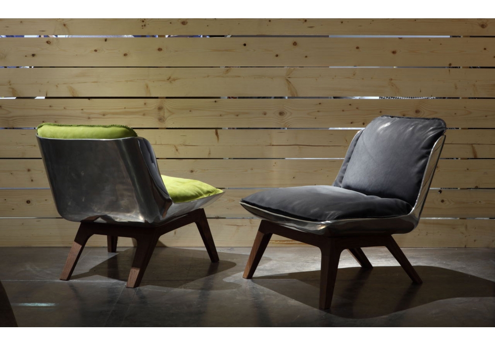 Houston firmata da Paola Navone per Baxter è una poltrona con rivestimento in pelle morbida. Base in frassino spazzolato tinto noce e scocca in fusione di alluminio lucidato spessa 7 mm. Cuscinature in piuma d’oca lavata e sterilizzata con inserto in