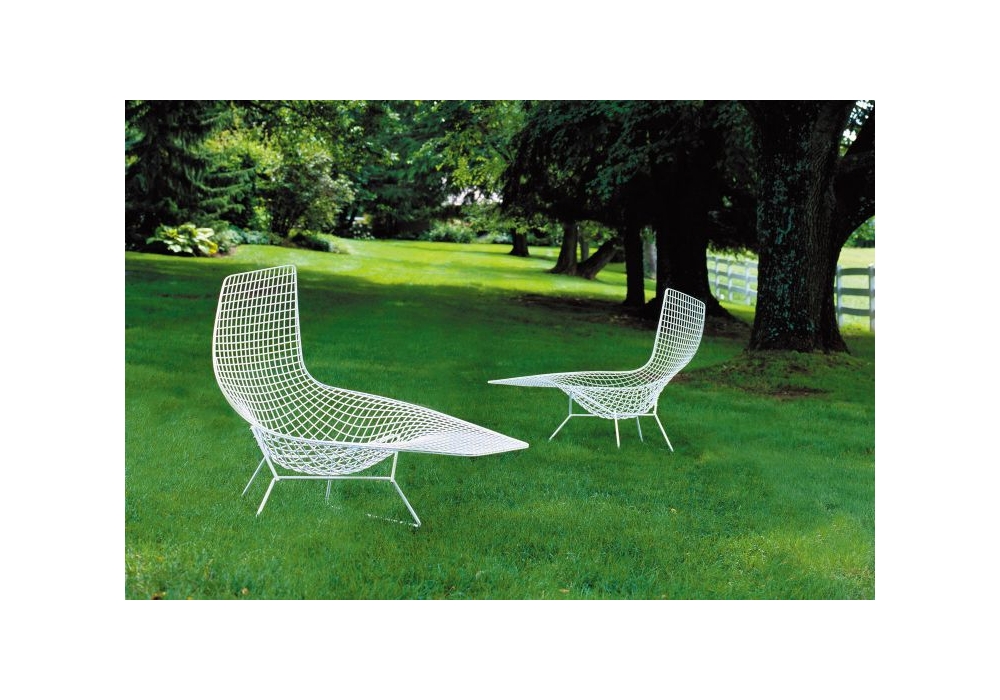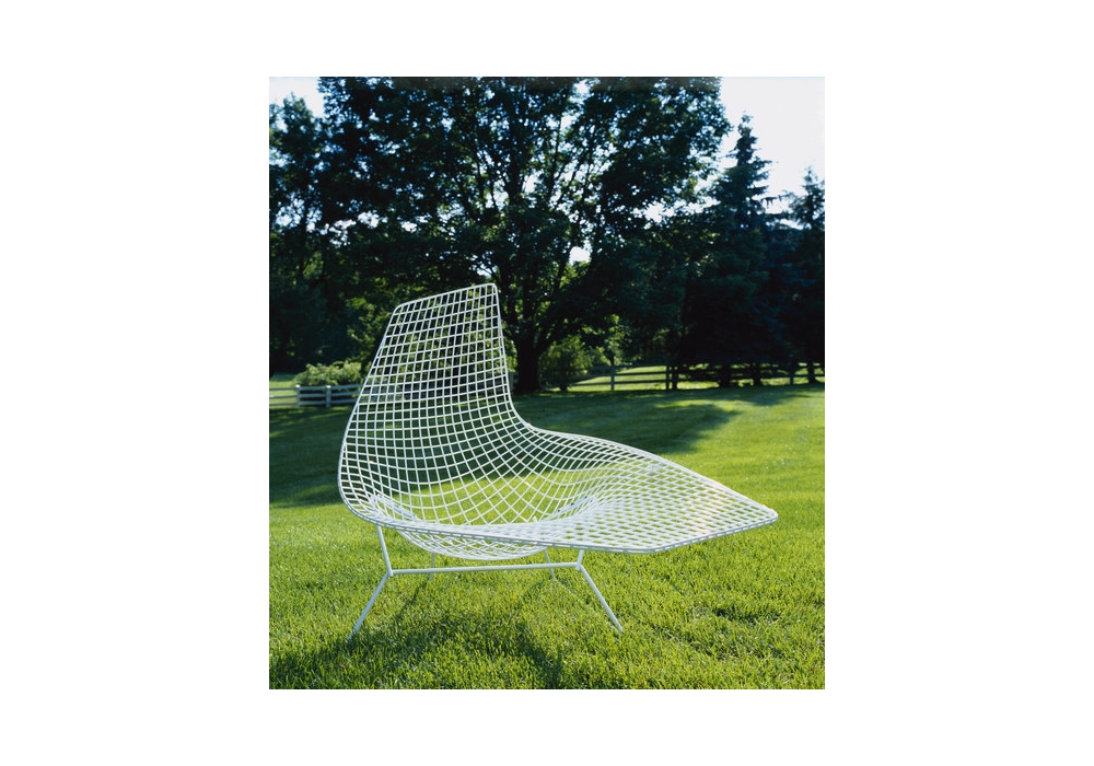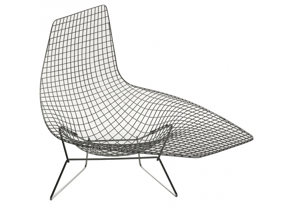 Bertoia firmata da Harry Bertoia è una poltrona asimmetrica con struttura in tondino d'acciaio saldato ad ogni intersezione con finitura cromata lucida o in Rilsan in finitura bianca.