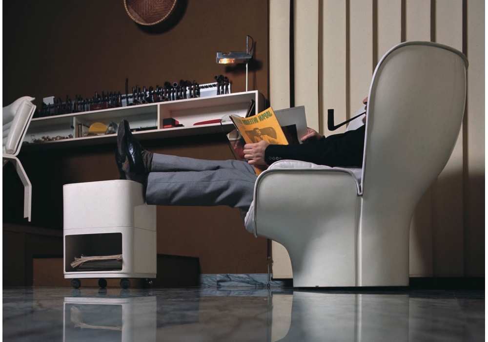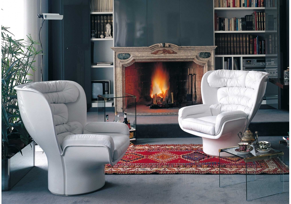 Elda firmata da Joe Colombo per Longhi è una poltrona con scocca girevole a 360° realizzata in vetroresina lavorata a mano, rivestimento interno in pelle o tessuto non sfoderabile imbottito con poliuretano espanso a quote differenziate, anatomiche, ricoperte in Dacron. Su richiesta è disponibile con scocca metallizzata o interamente rivestita in pelle.