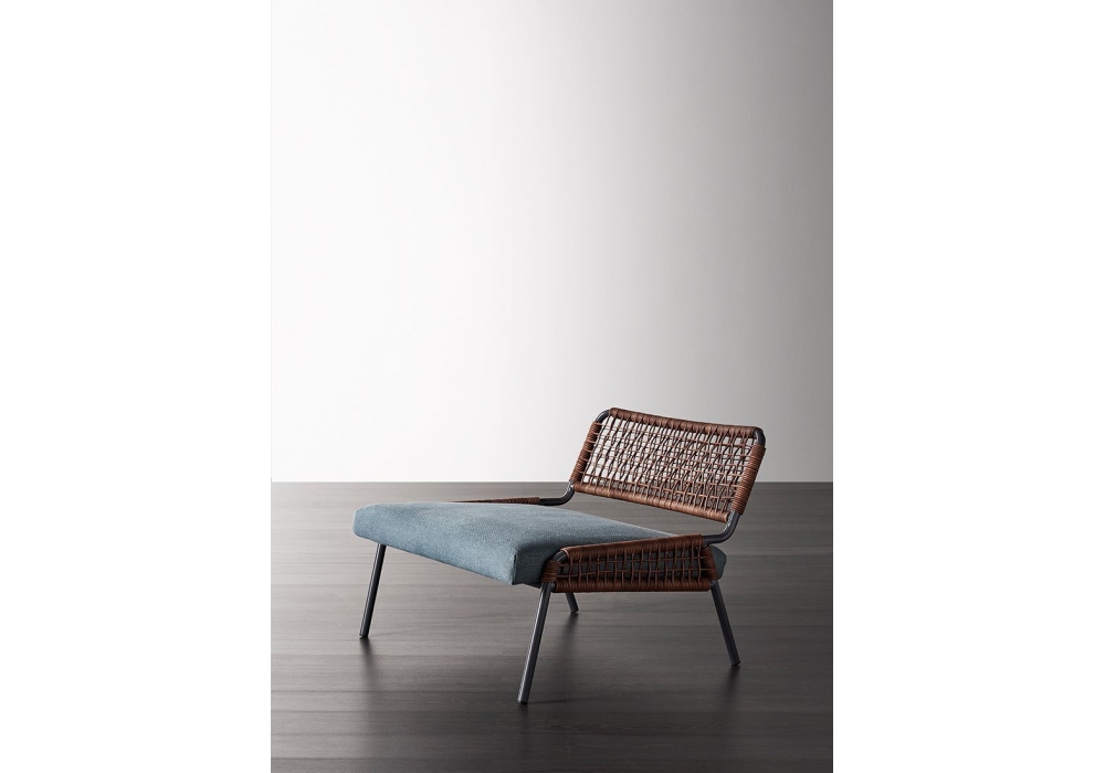 Zoe firmata da Andrea Parisio per Meridiani è una poltrona con struttura in alluminio verniciato e cuscino di seduta in poliuretano e fibra di poliestere. Schienale e fianco con intrecco checked in corda di cuoio naturale.