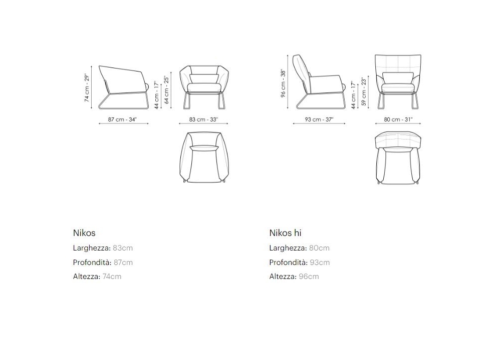 Nikos è una poltrona disegnata da Sergio Bicego per Bonaldo. La struttura della poltrona è in metallo e il rivestimento in tessuto o pelle. La base è in metallo verniciato opaco. Disponibile in 2 modelli.