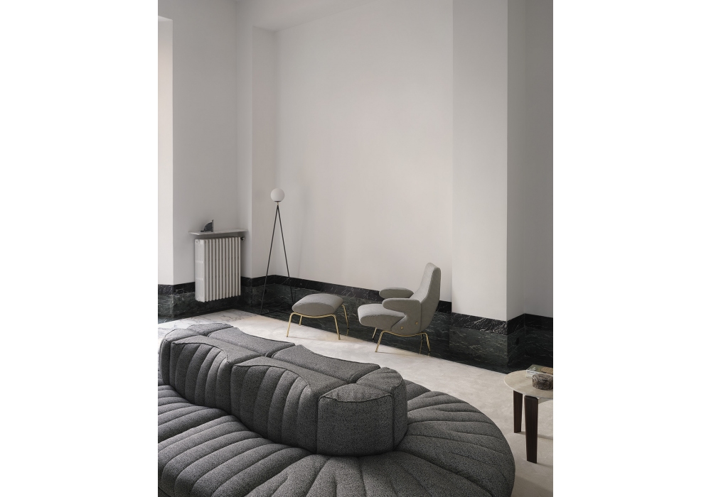 Delfino firmata da Erberto Carboni per Arflex è una poltrona con struttura in metallo laccato nero o dorato. Rivestimento in tessuto o pelle.