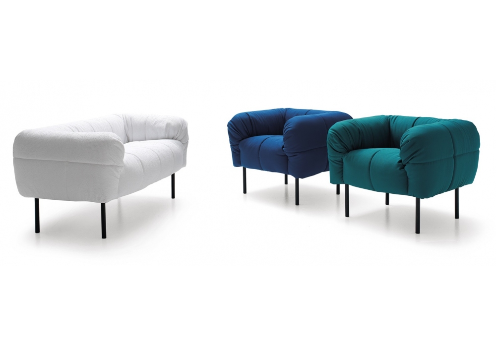 Pecorelle firmata da Cini Boeri per Arflex è una poltrona con struttura in metallo laccato nero. Rivestimento in tessuto. Il tessuto è accoppiato con fibra di poliestere e cotone, per ottenere una trapunta.