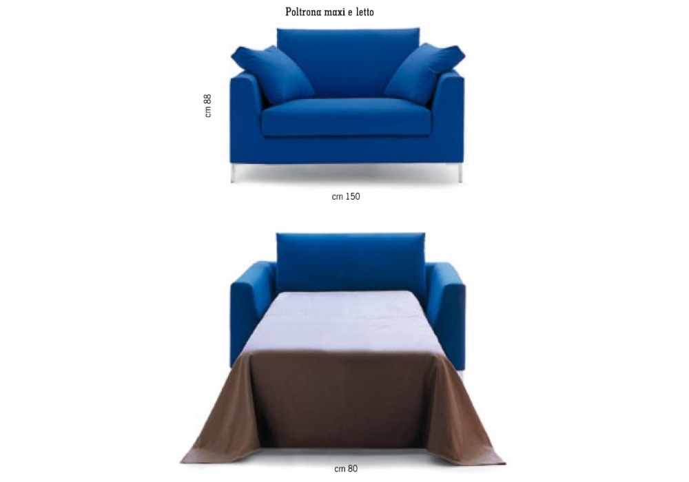 Aoy firmata da Campeggi è una poltrona letto facilmente trasformabile con piedini in acciaio cromato, rivestimento sfoderabile. Rete del letto in acciaio elettrosaldato e materasso a molle o in poliuretano. Cuscini laterali esclusi!