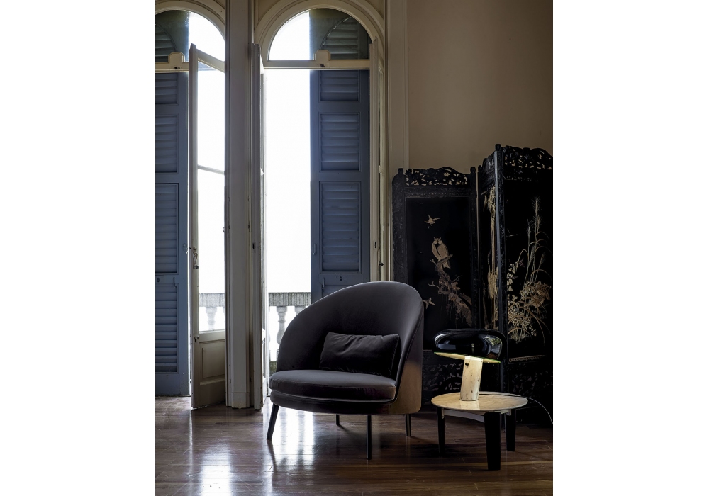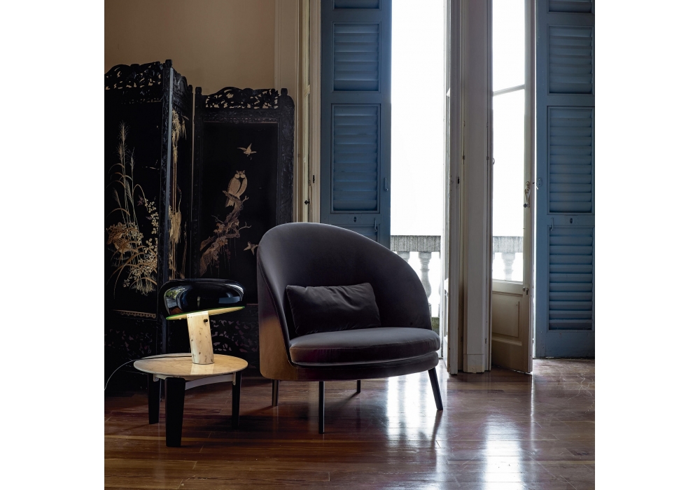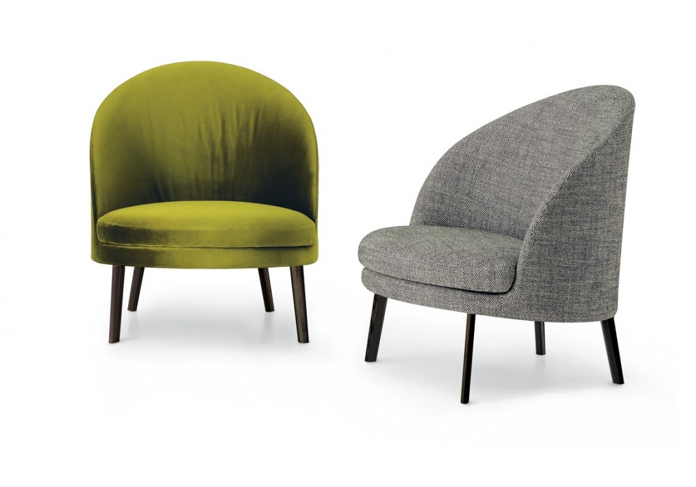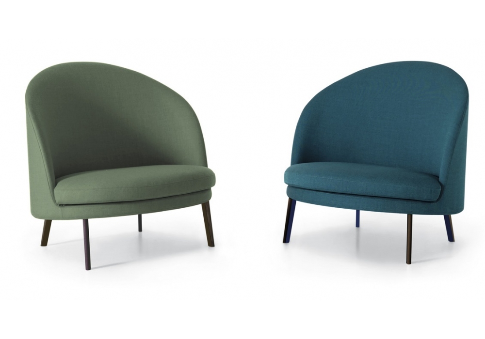 Jim firmata da Claesson Koivisto Rune per Arflex è una poltrona con basamento in metallo laccato, imbottitura in poliuretano schiumato in stampo / fibra di poliestere e rivestimento in tessuto o in pelle. Basamento disponibile anche con profili in legno.