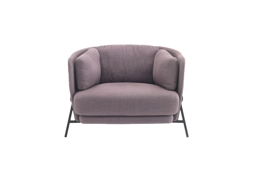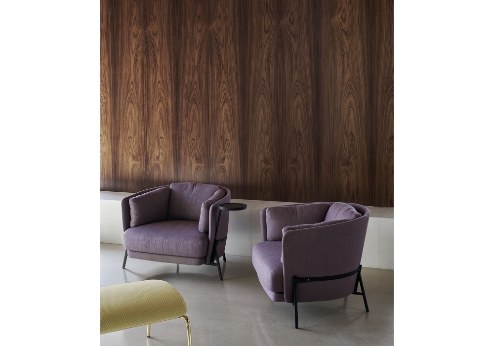 Cradle firmata da Neri& Hu per Arflex è una poltrona con struttura in metallo laccato nero. Cuscino seduta in poliuretano sagomato a densità differenziata / fibra di poliestere. Cintura in pelle e rivestimento in tessuto o in pelle.