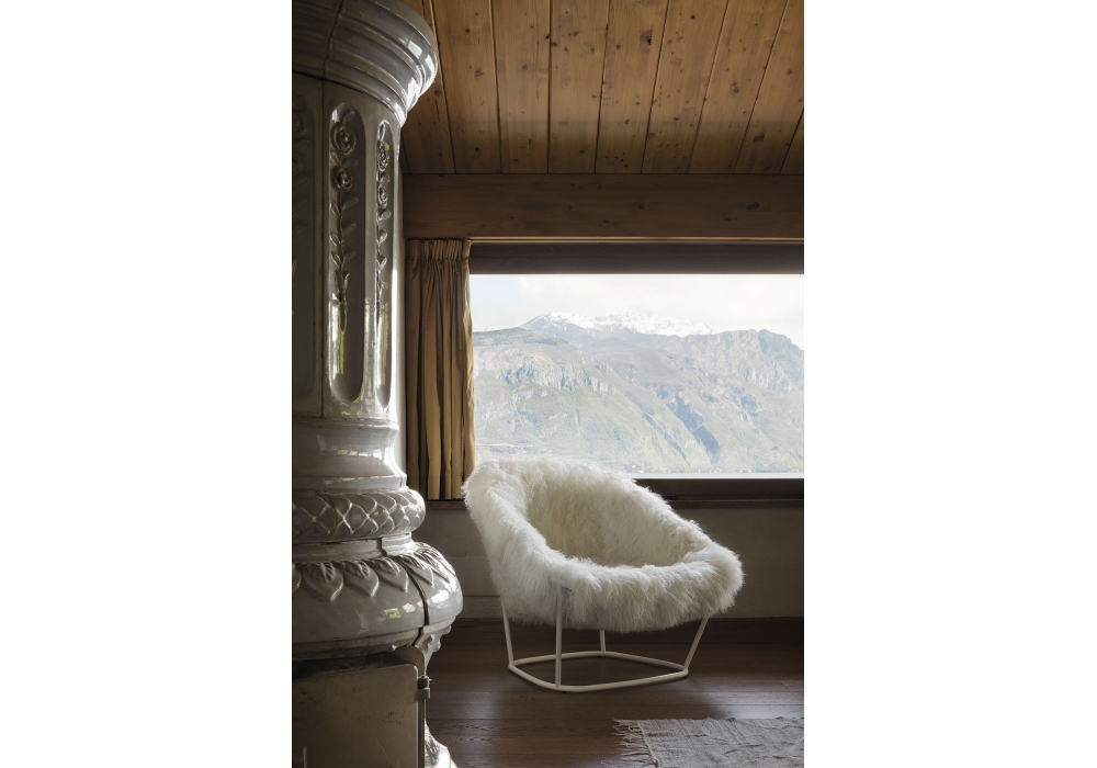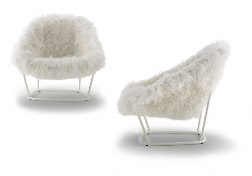 Katrin firmata da Carlo Colombo per Arflex è una poltrona con basamento in metallo laccato bianco o nero. Rivestimento in pelliccia nei colori bianco, nero, blu o rosa. Totalmente sfoderabile.