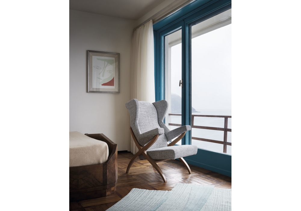 Fiorenza firmata da Franco Albini per Arflex è una poltrona con struttura in faggio tinto noce o laccato nero. Imbottitura in poliuretano sagomato a densità differenziata. Rivestimento in tessuto o pelle.