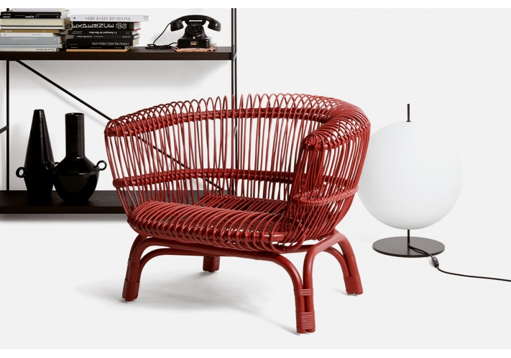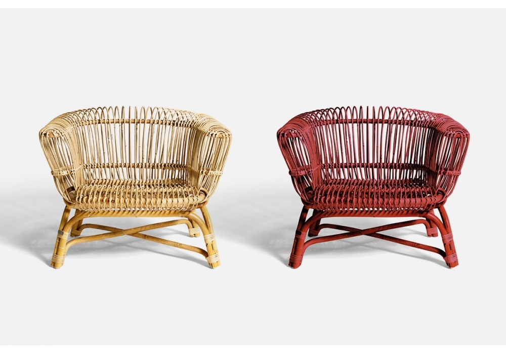Silvia firmata da P. Tilche / Archivio storico Bonacina per DePadova è una poltrona con struttura in malacca, armatura in canna d'India e legature in corteccia di giunco. Piedini in termoplastica. Disponibile in finitura naturale o laccata rosso.
