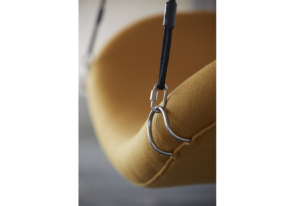 Flying Chair firmata da Verner Panton per Verpan è un'altalena completamente imbottita. É sospesa al soffitto su entrambi i lati mediante corde di nylon che consentono di regolare l'altezza e la posizione di seduta. Scocca in compensato modellato e struttura portante in acciaio circondato da schiuma e corde in nylon incl. Rivestimento in differenti tessuti.