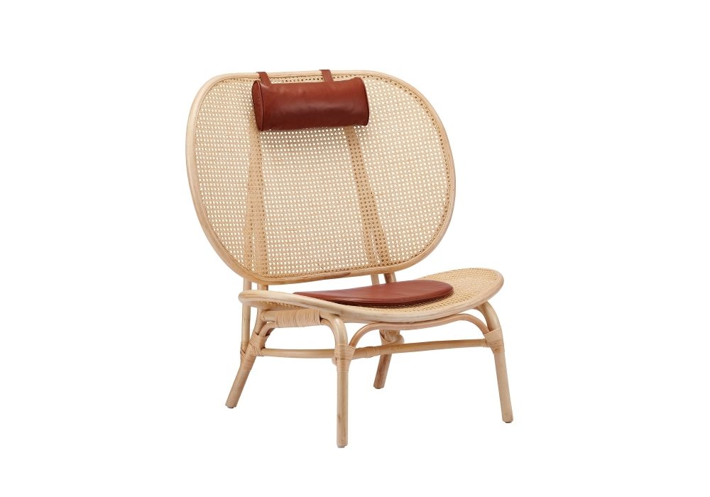 Nomad Chair firmata da Kristian Sofus Hansen e Tommy Hyldahl per Norr11 è una poltrona con una struttura in legno, seduta e schienale in rattan con cuscini seduta e poggiatesta in pelle.
