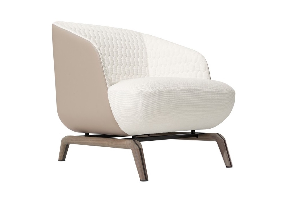 Janet firmata da Umberto Asnago per Giorgetti è una poltrona con scocca rivestita in tessuto o pelle, rivestimento interno in tessuto, rivestimento schienale disponibile in versione trapuntata esagonale o liscia. Base in metallo verniciato finitura peltro e profili in massello di noce canaletto disponibili in diverse finiture.