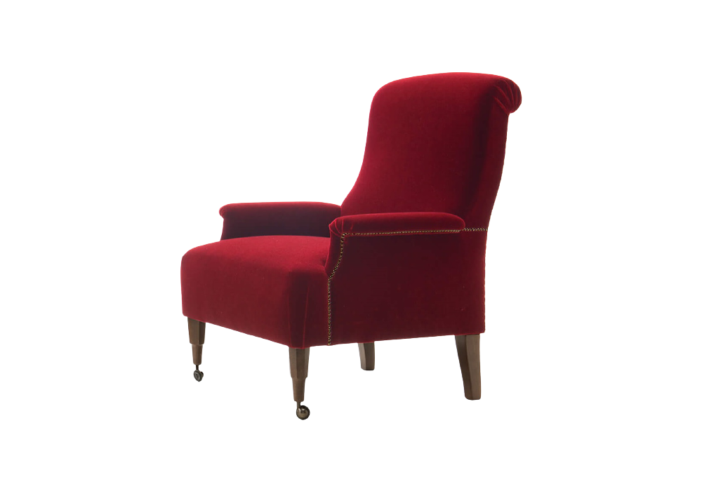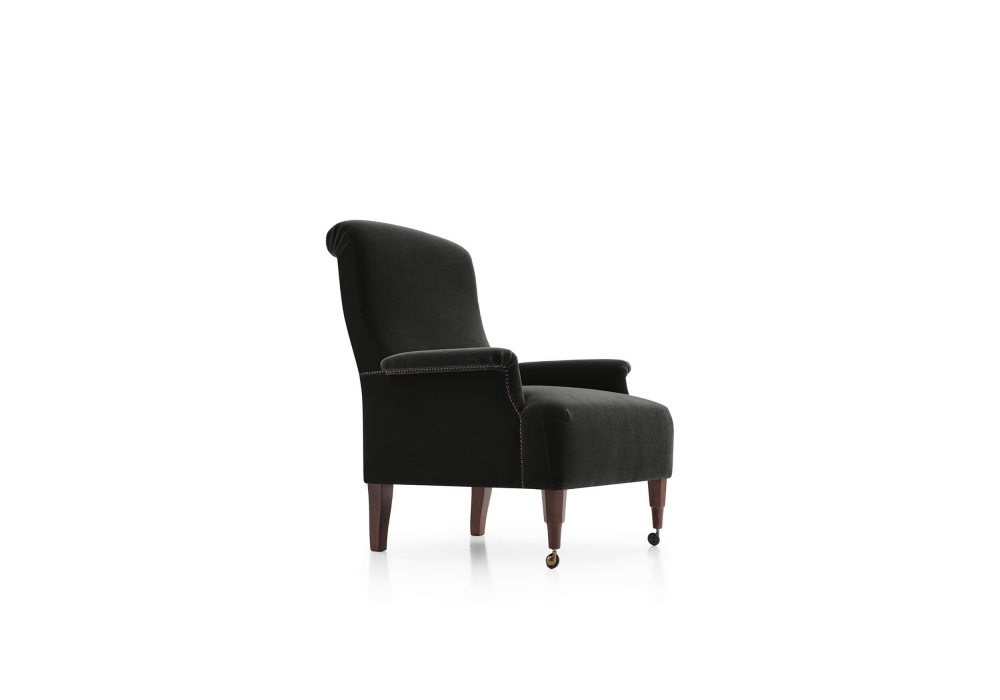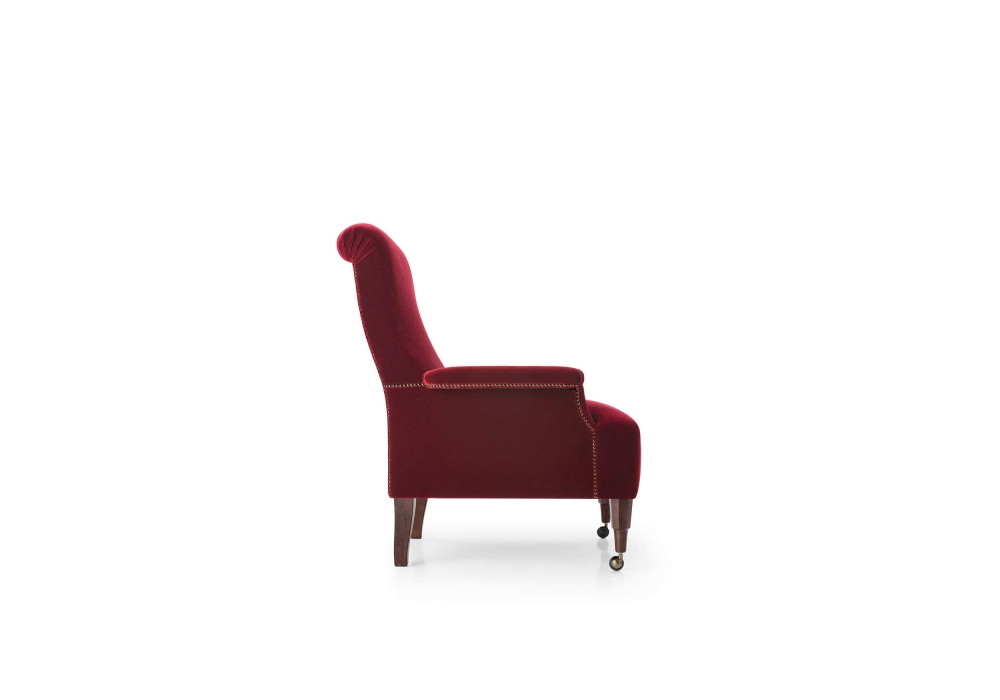 Abcd firmata da Luigi Caccia Dominioni per Azucena è una poltrona, con rivestimento disponibile in diversi materiali. Piedini tinti in noce, ruote anteriori e borchie con finitura bronzata.