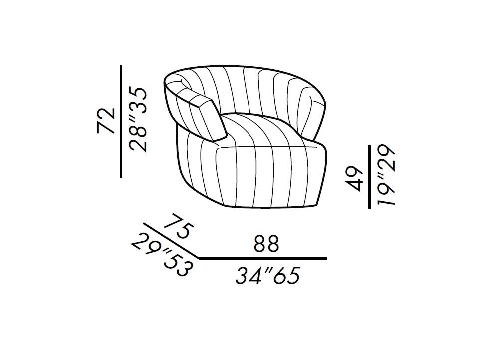 Josephine Stripe firmata da Andrea Parisio per Meridiani è una poltrona con rivestimento imbottito e trapuntato con cuciture verticali, struttura in legno e imbottitura in poliuretano indeformabile. Basamento girevole in metallo verniciato nero opaco.