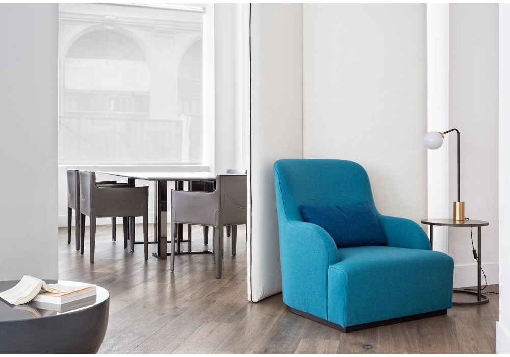 Liu Skin firmata da Andrea Parisio per Meridiani è una poltrona con basamento in legno di rovere tinto black. Appoggiareni in piuma supportata. Rivestimento disponibile in tessuto o pelle.
