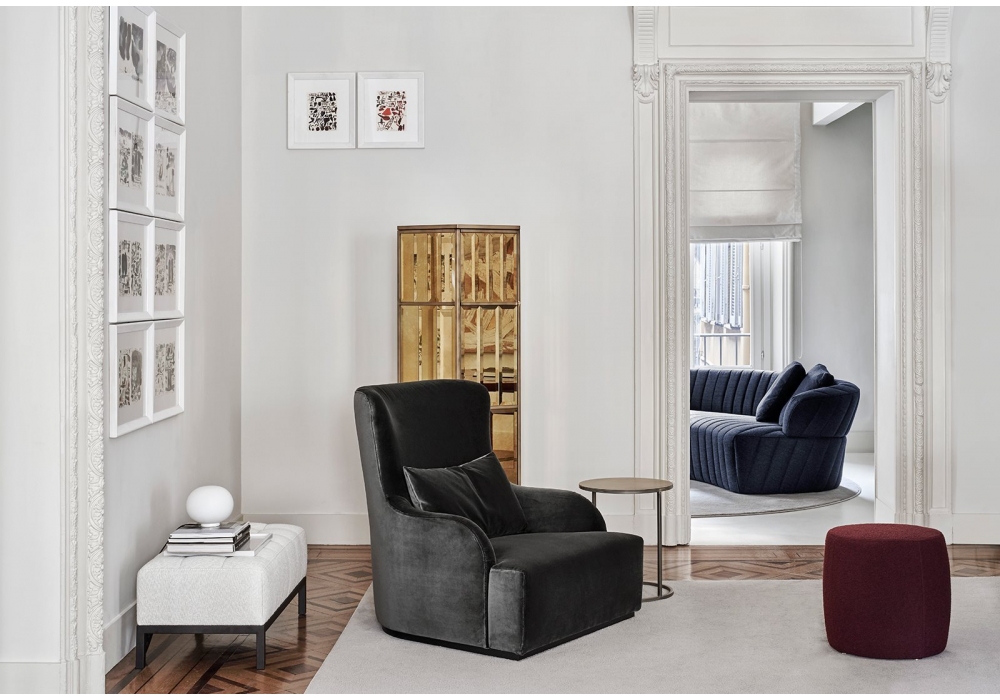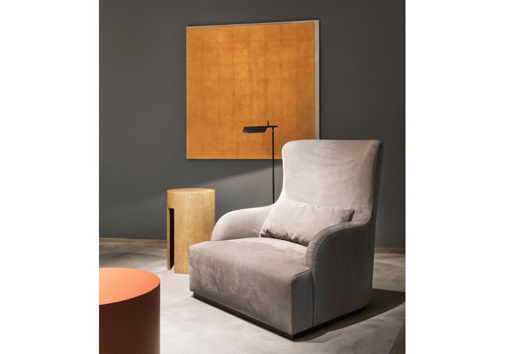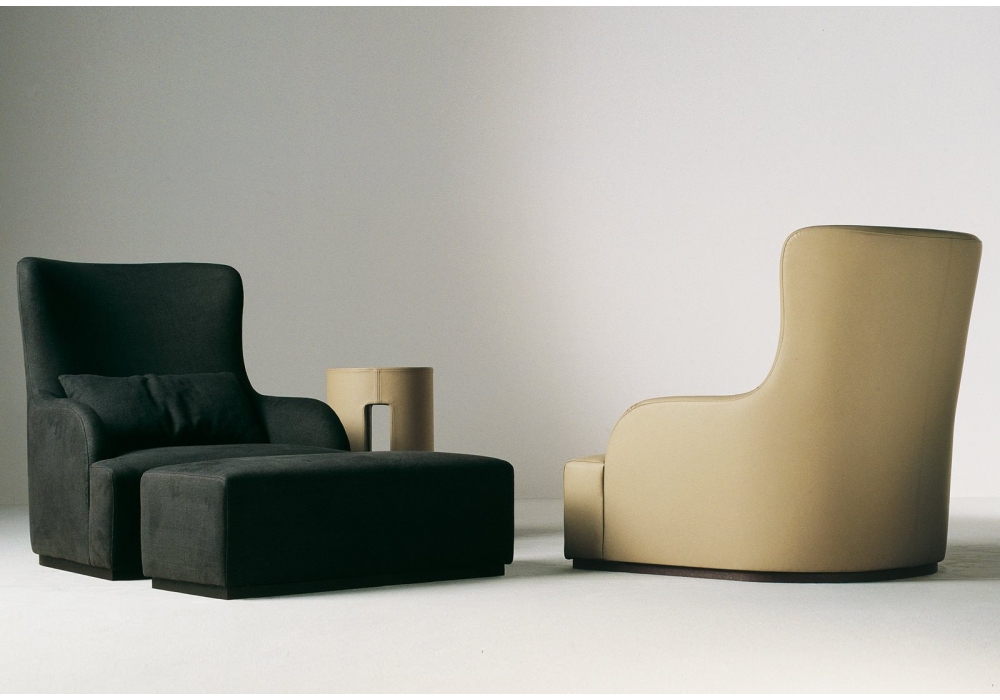 Liu Skin firmata da Andrea Parisio per Meridiani è una bergère con basamento in legno di rovere tinto black. Appoggiareni in piuma supportata. Rivestimento disponibile in tessuto o pelle.