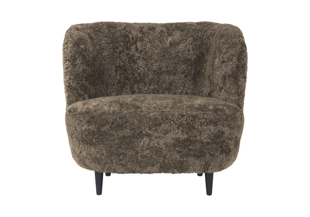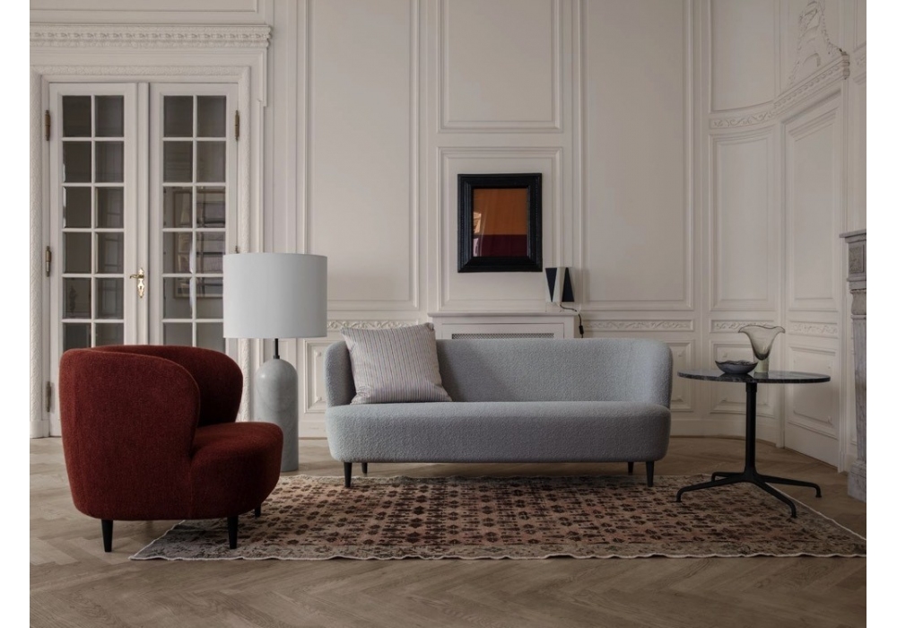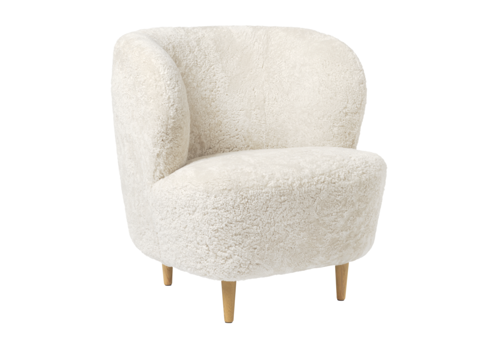 Stay firmata da Space Copenhagen per Gubi è una poltrona lounge con gambe in legno e rivestimento in tessuto o pelle.