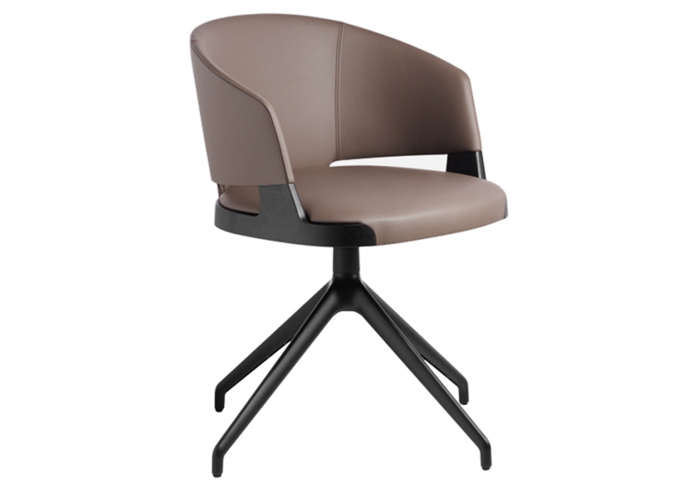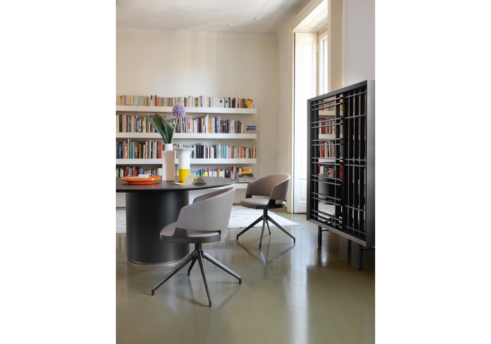 Velis firmata da Mario Ferrarini per Potocco è una poltrona con struttura in metallo e legno di frassino o noce canaletto in differenti finiture. La base è girevole a quattro razze in metallo verniciato nero goffrato. Seduta e schienale sono imbottiti con schiuma poliuretanica ignifuga e rivestiti in svariati tipi di tessuto, pelle o ecopelle.