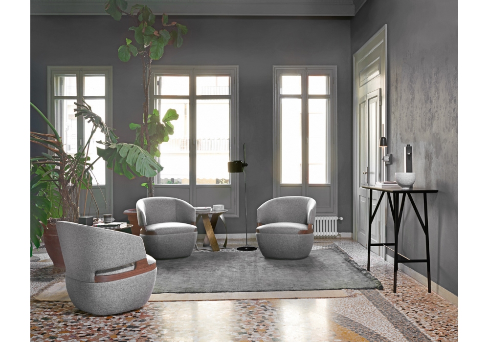 Velis firmata da Mario Ferrarini per Potocco è una poltrona girevole interamente rivestita con struttura in legno di frassino o noce canaletto in differenti finiture. Seduta e schienale sono imbottiti con schiuma poliuretanica ignifuga e rivestiti in svariati tipi di tessuto, pelle o ecopelle.