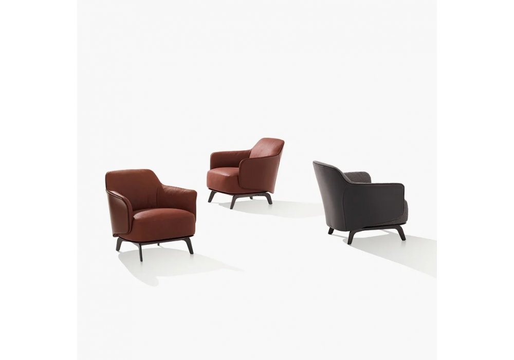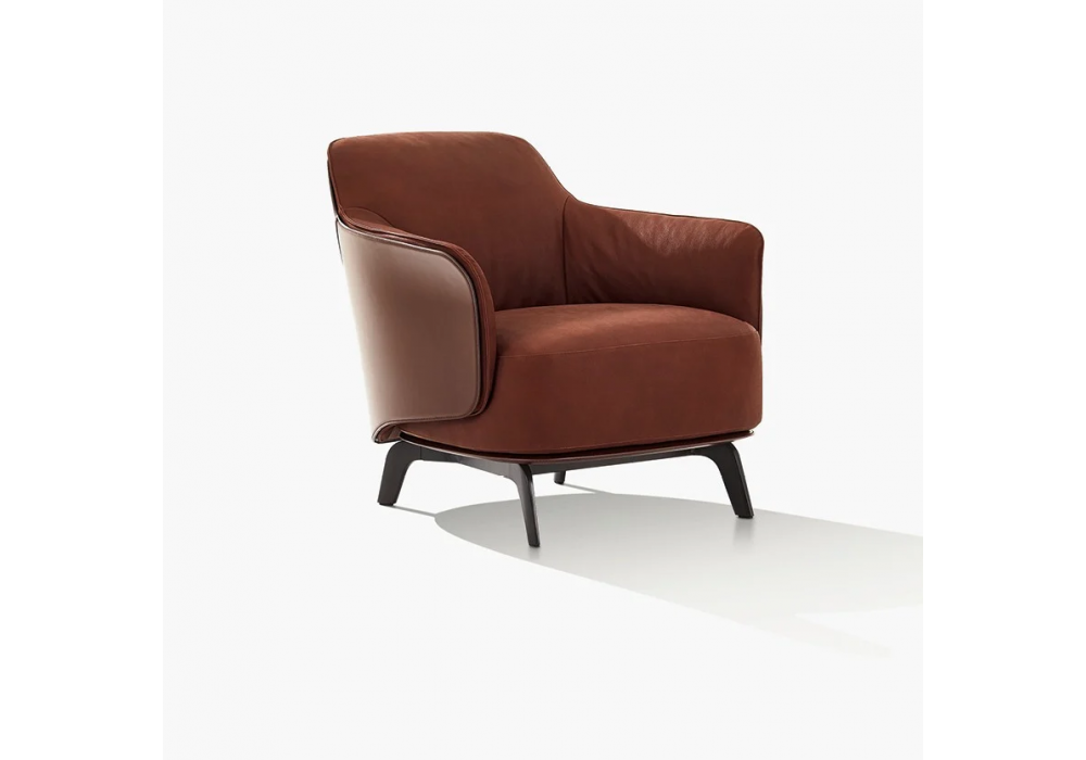 Kaori firmata da Jean-Marie Massaud per Poliform è una poltrona con scocca esterna e base rivestite in cuoio, scocca interna e seduta disponibile con rivestimento in tessuto o pelle. Piedini in alluminio e struttura in acciaio verniciati champagne opaco o brown nickel, opaco e lucido.