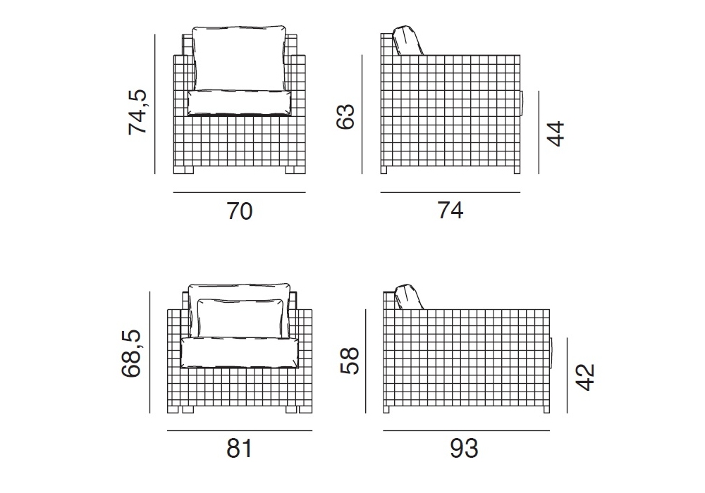 | Dimensioni | 70 x 74 x H 74.5 cm; 81 x 93 x H 68.5 cm. |