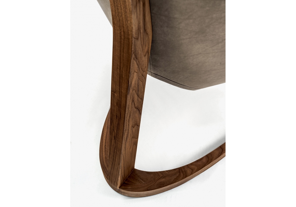 Yin & Yang Lounge Chair firmata da Steve Leung per Riva 1920 è una poltrona dotata di telaio in noce massello completamente tornita, assemblata e levigata a mano. I curvati compongono la struttura seguendo una linea di continuità tra basamento e seduta, ricavata da un multistrato tondo e concavo rivestito in pelle Camoscio con cuciture a vista.