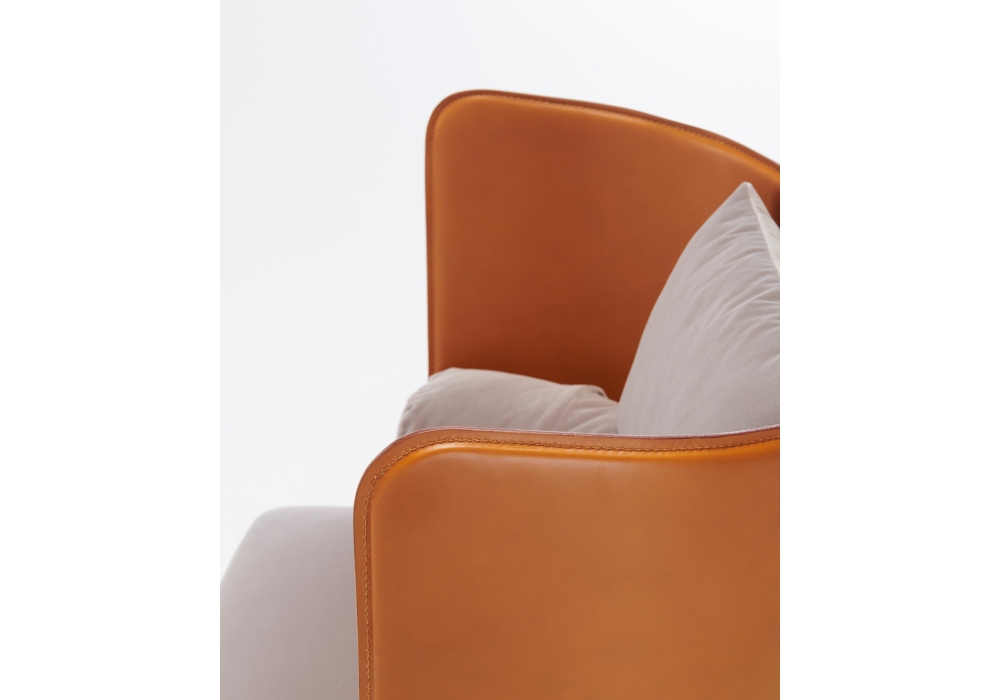 880 Campiello+ firmata da De Pas, D'Urbino, Lomazzi per Zanotta è una poltrona con schienale in multistrato di legno ricoperto in cuoio, sedile in poliuretano a quote differenziate/fiocchi di poliestere rigenerato e rivestimento esterno sfilabile in stoffa. Solo il cuscino poggiareni può essere richiesto in un colore diverso all’interno della stessa tipologia di tessuto.