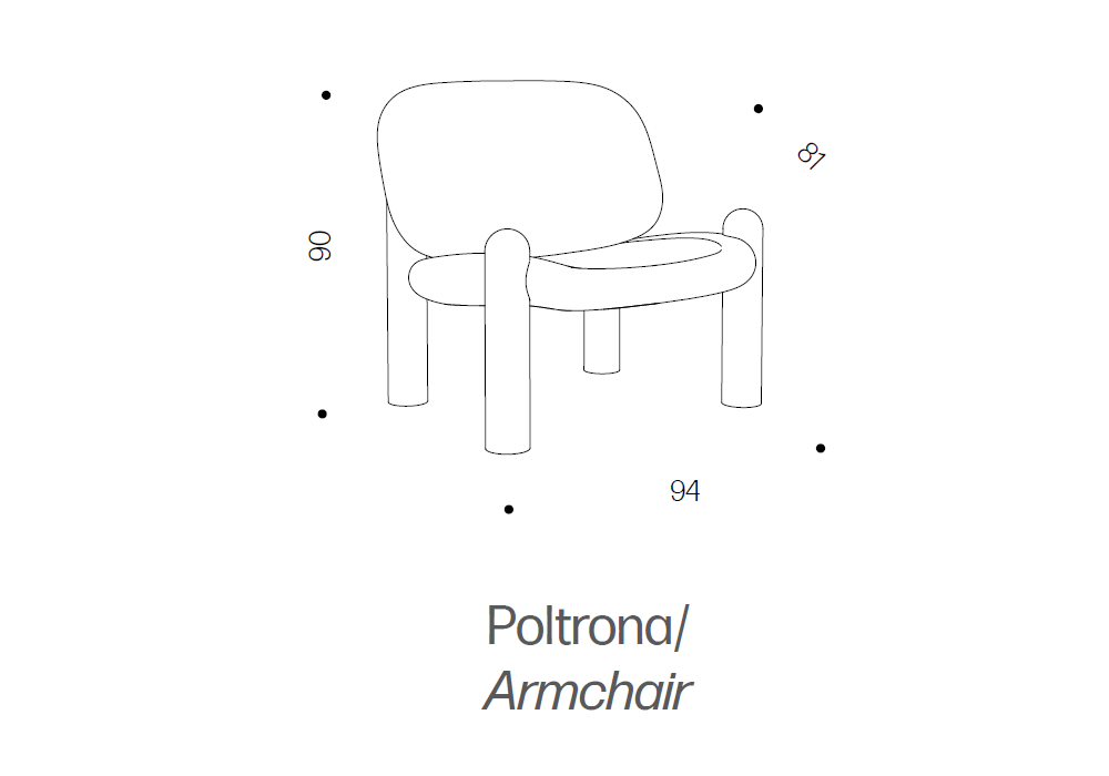 Tottori firmata da Kateryna Sokolova per Driade è una poltrona con struttura in poliuretano flessibile a media densità, piedini in PE per l'appoggio a terra. Il rivestimento è fisso con la possibilità di materiali differenti per le gambe rispetto a quelli di seduta e schienale. Uso solo interno.
