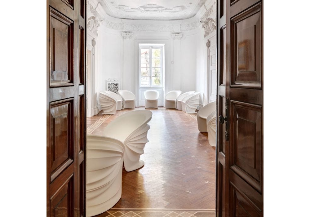 Modesty Veiled firmata da Italo Rota per Driade è una poltrona monoblocco in polietilene disponibile in due varianti di colore: bianco o grigio chiaro. Uso interno/esterno.