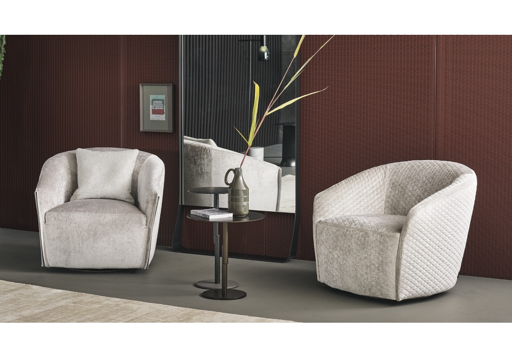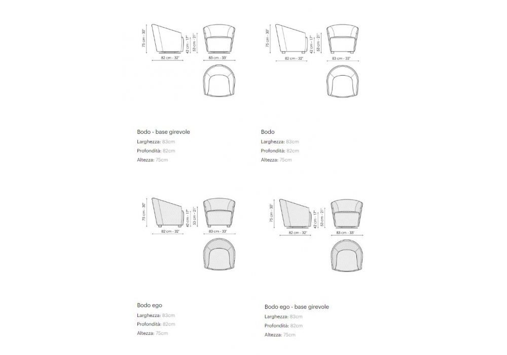 Bodo firmata da Mauro Lipparini per Bonaldo è una poltrona con base fissa o girevole, rivestita in tessuto o pelle. Il bracciolo ha un inserto in pelle, in diverse finiture. La base è in metallo verniciato in vari colori.
