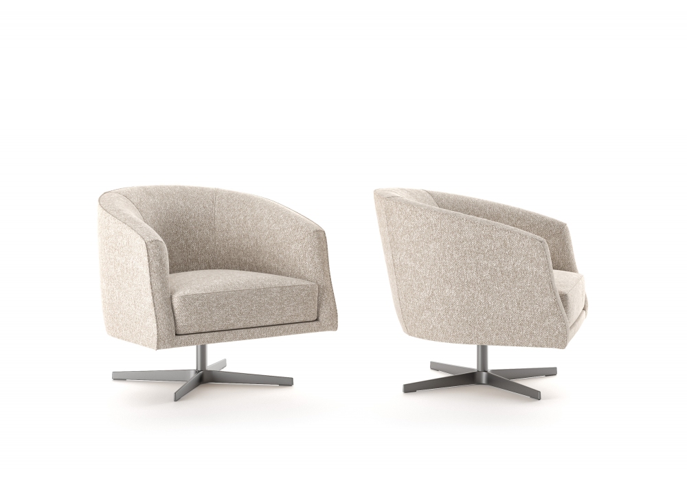 Leslie firmata e prodotta da Marac è una poltrona con struttura in legno di abete (Picea Abies) e multistrato, con cinghie elastiche. Base base girevole in metallo. Rivestimento in differenti finiture, fisso in tessuto e in pelle.