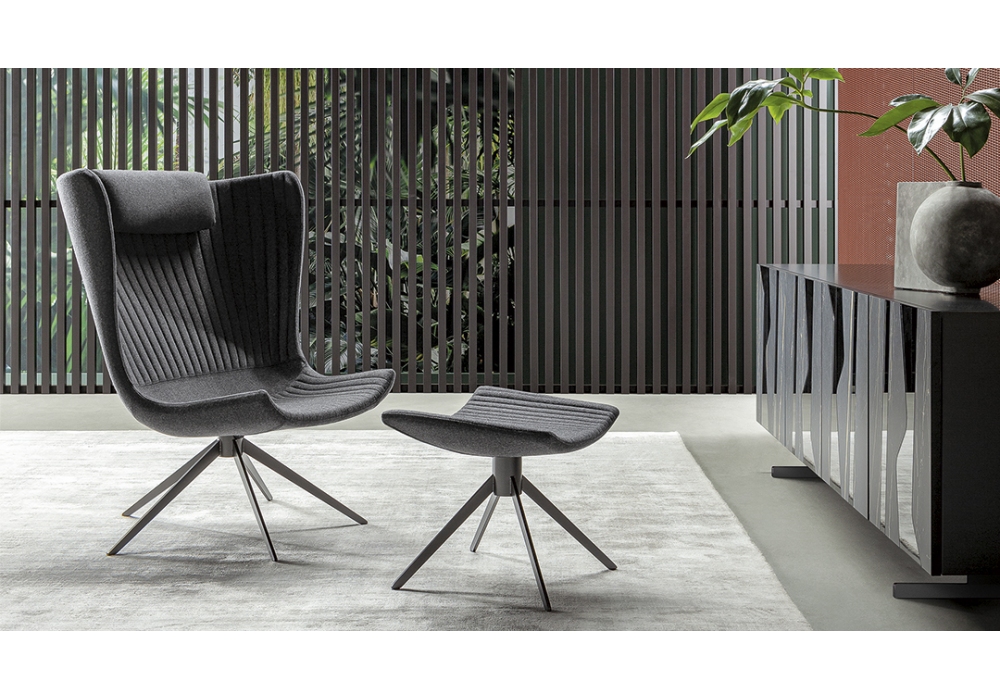 Colibrì firmata da Fabrice Berrux per Bonaldo è una poltrona con base girevole in metallo verniciato opaco in diversi colori e rivestimento, non sfoderabile, in pelle o tessuto in varie finiture. L'imbottitura della seduta è in poliuretano espanso, così come quella del poggiatesta rifinito da uno strato di piuma bianca. E' possibile abbinare un poggiapiedi nella stessa finitura.